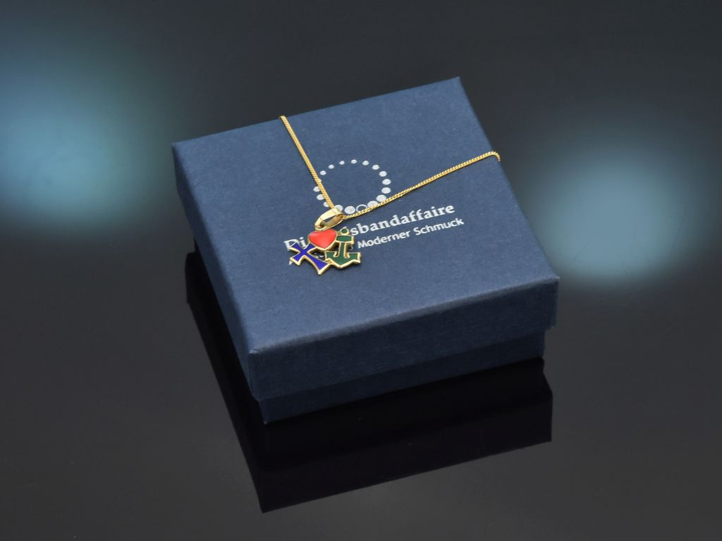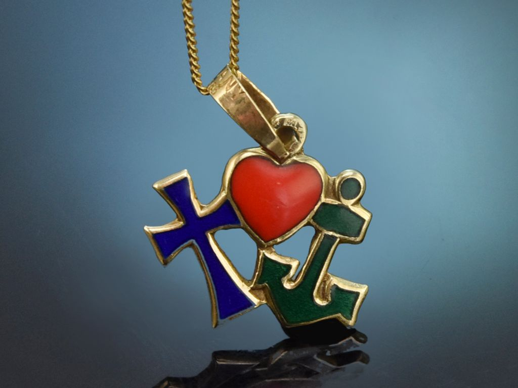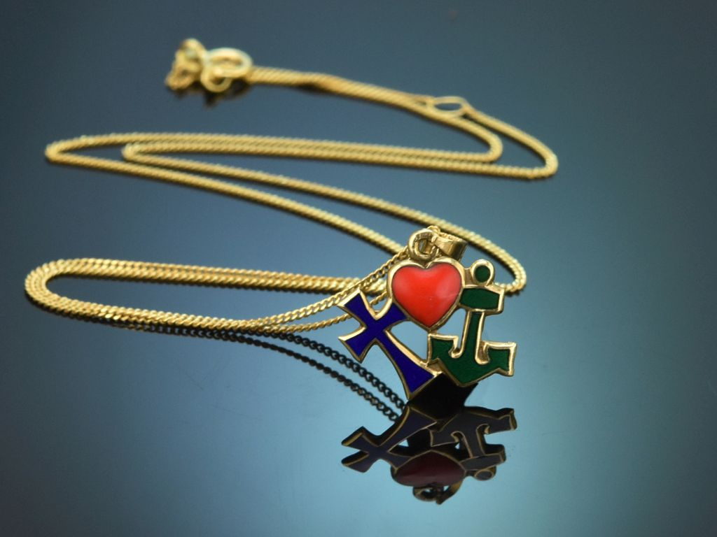 An einer zarten Flachpanzerkette sitzt ein charmanter Anhänger mit Symbolcharakter: Kreuz, Herz und Anker - alle mit farbprächtigem Emaille verziert - stehen für die drei theologischen Tugenden Glaube, Liebe und Hoffnung, die zusammen mit den vier Kardinaltugenden das Ideal eines christlich ausgerichteten Lebens versinnbildlichen.
