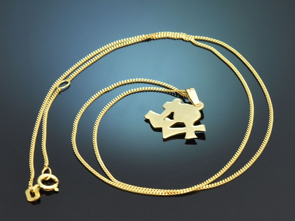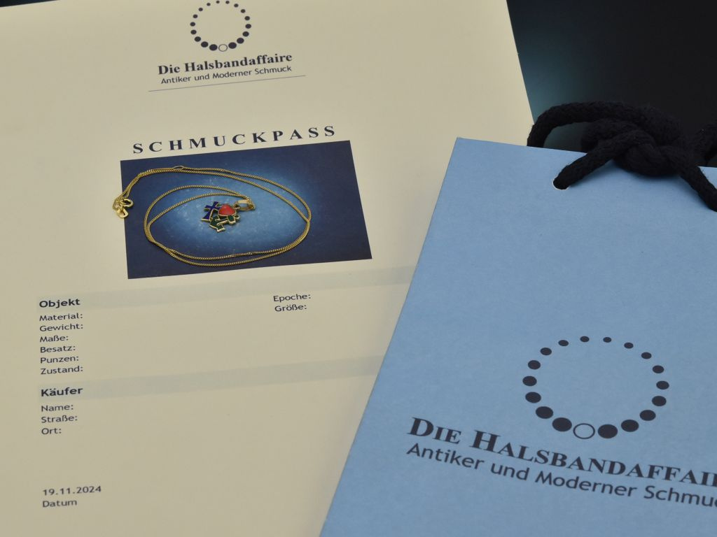 Der historische Anhänger aus Gold 585/ ist mit einer später ergänzten Kette in feinem Flachpanzermuster aus Gelbgold 333 / 8 Kt (gestempelt und garantiert) verbunden. Diese wird im Nacken mit einem Federring verschlossen und kann durch eine zusätzliche Öse auf zwei Längen getragen werden.