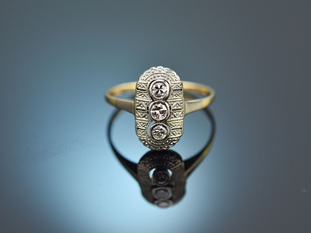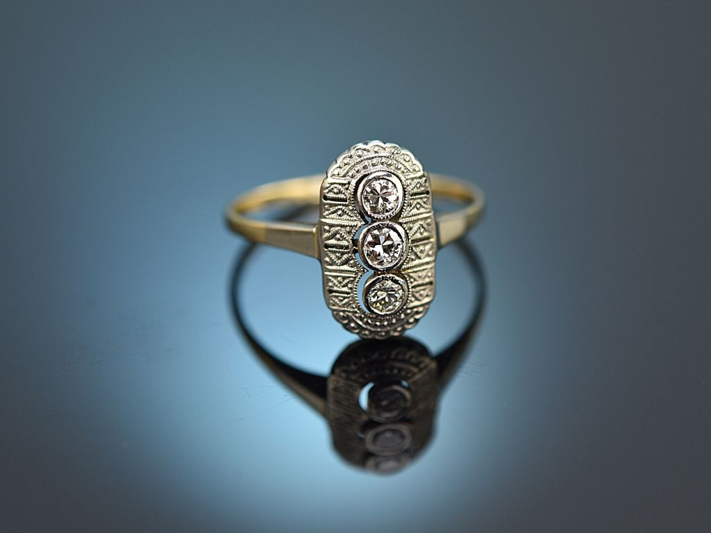Der hochovale Ringkopf mit Platinauflage ist mit drei funkelnden Diamanten in Übergangsschliff von zus. ca. 0,2 Carat besetzt, die sich im schönen Qualitätsbereich befinden (H-I, VS2-SI1). Neben den Diamanten ist der Ring zusätzlich mit sehr feinem zeitgenössischen, geometrischem Millegriffe-Dekor verziert. Die schlanke Ringschiene aus Gelbgold rundet den Entwurf harmonisch ab.