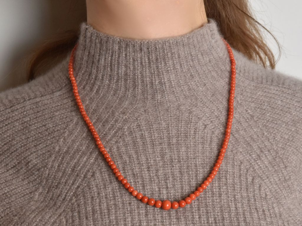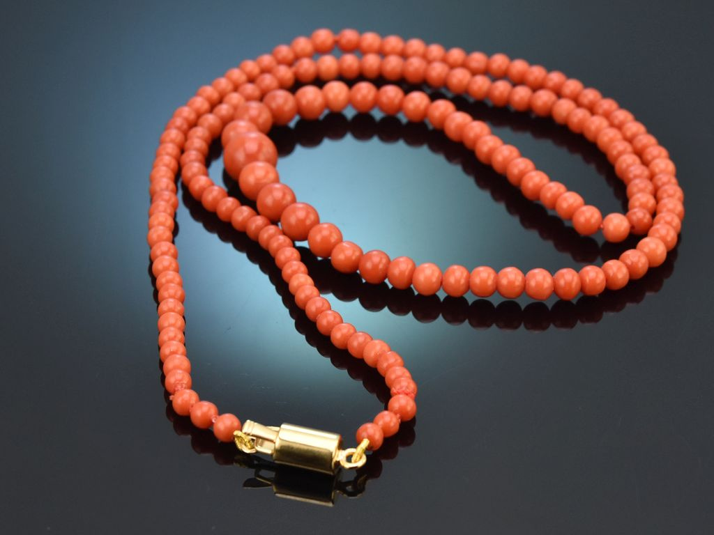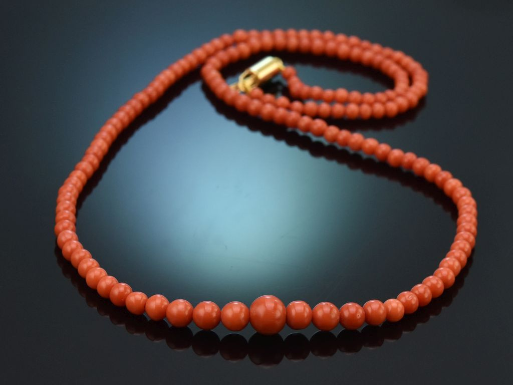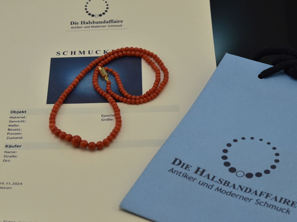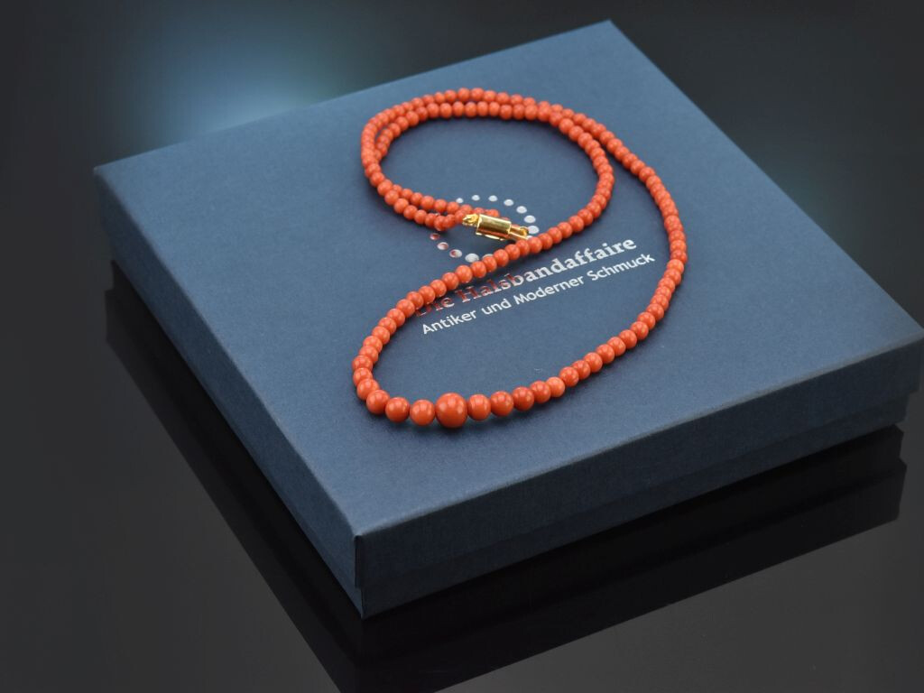 Die Korallenkette besteht aus einem Strang echter, unbehandelter, italienischer Mittelmeerkoralle in einem schönen Rot. Die einzelnen Korallenkugeln sind im Größenverlauf auf Nylonseide aufgezogen und münden in einer schlichten Steckschließe aus vergoldetem Silber.