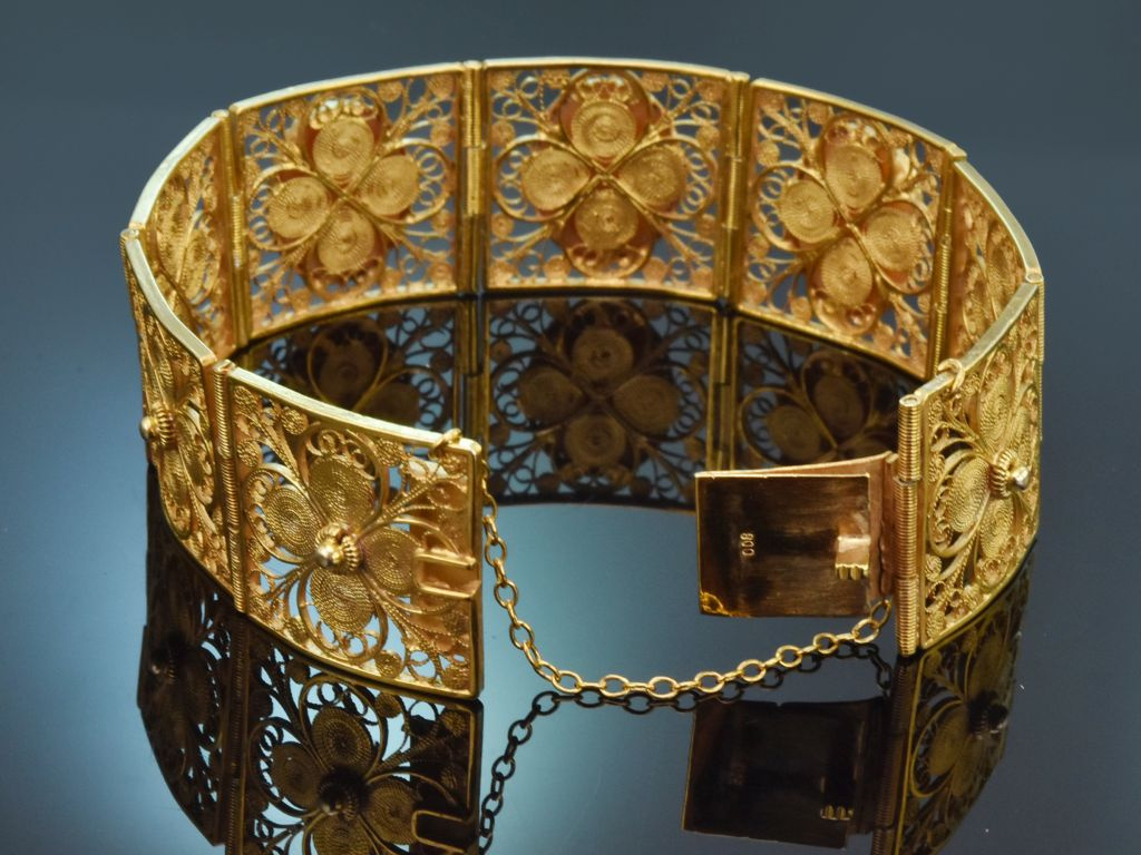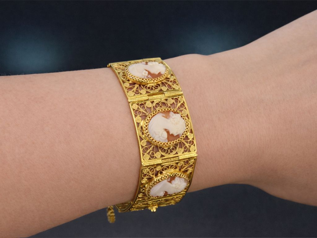 Das dekorative Armband besteht aus acht quadratischen Gliedern, die durch bewegliche Scharniere miteinander verbunden sind. Jedes Glied ist mit Filigranornamenten in Vierpassform gestaltet und mit zarten Ranken verziert. Auf drei der mittleren Glieder befindet sich jeweils eine ovale Muschelkamee, die eine fein geschnittene Darstellung einer mit Blüten geschmückten Dame im Profil nach rechts zeigt.