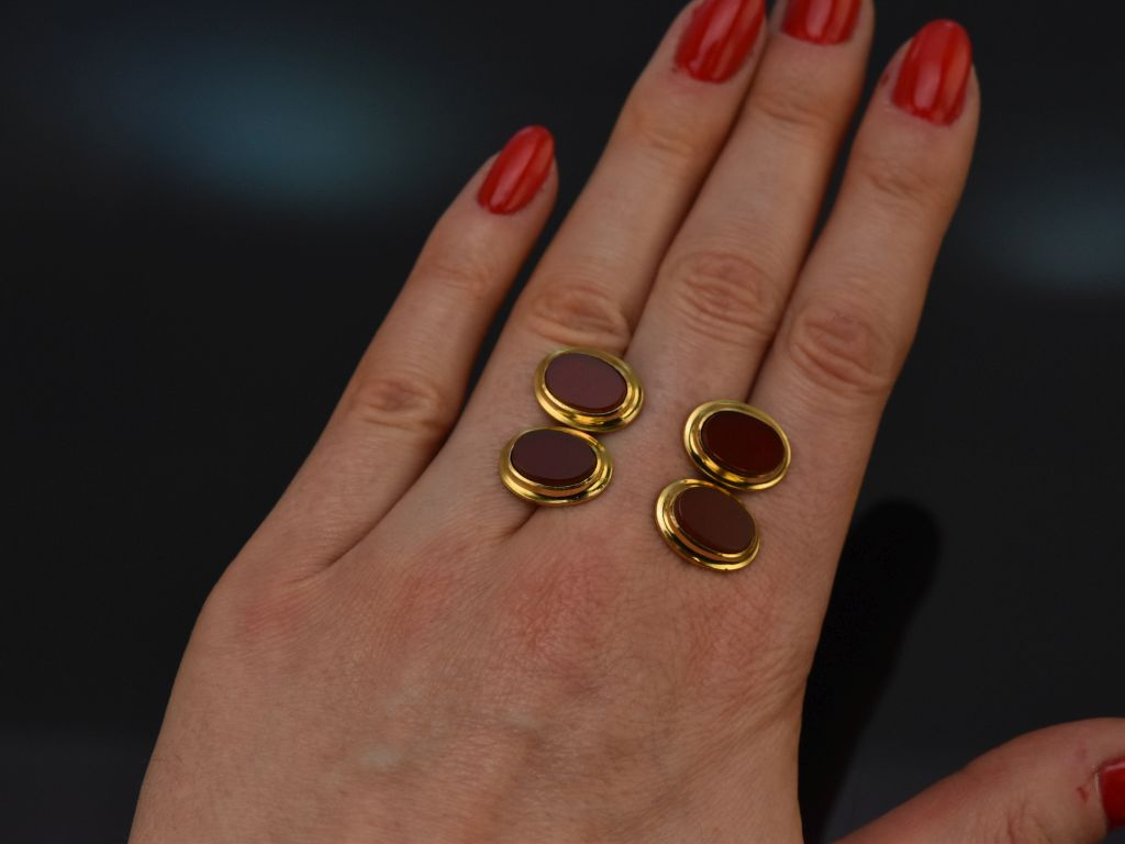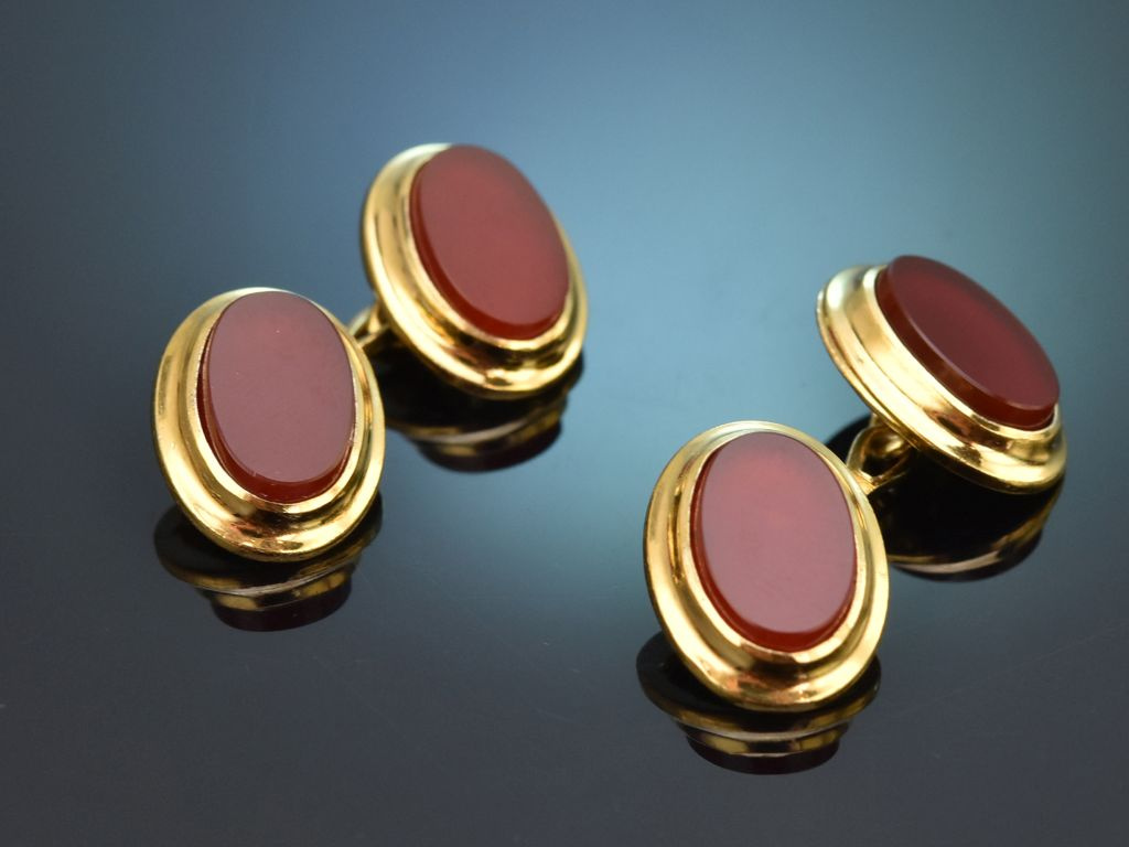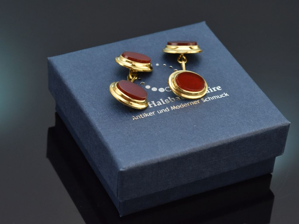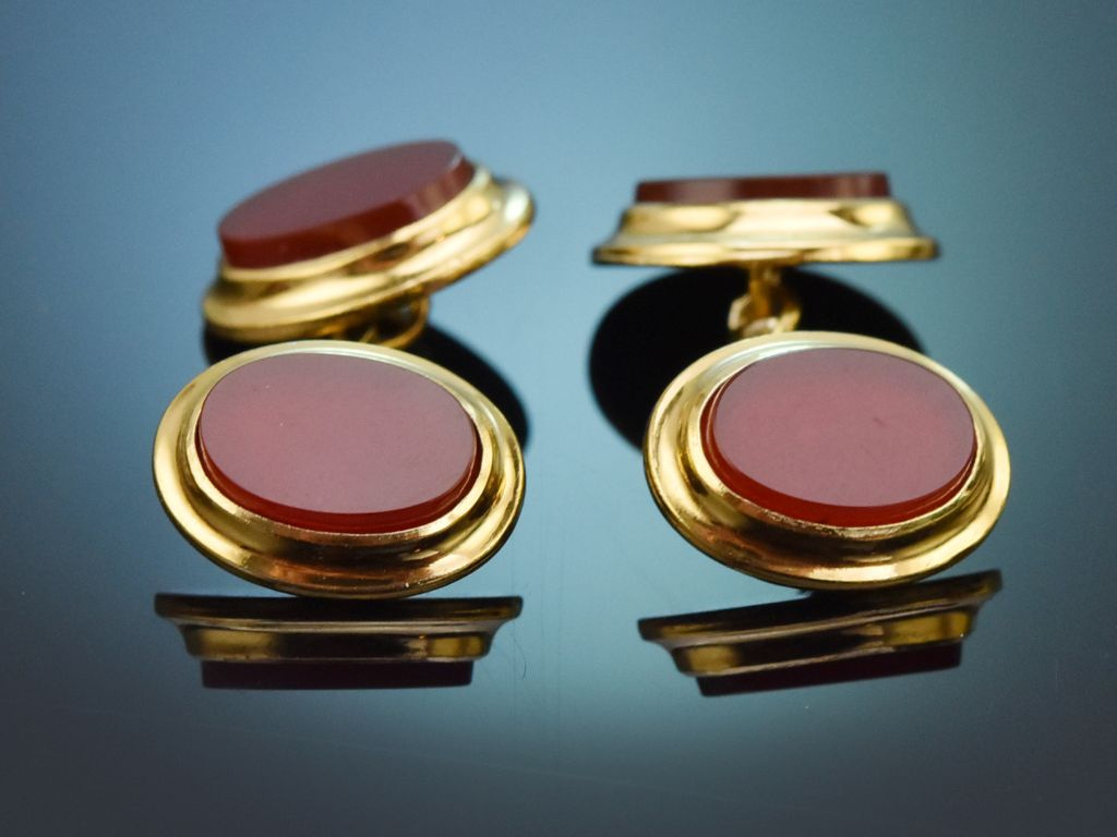 Die hochwertigen ovalen Manschettenknöpfe sind mit je zwei Karneolen in Tafelschliff besetzt. Die typisch rotbraunen Karneole harmonieren sehr schön mit dem vergoldetem Silber und tragen zur edlen, zeitlosen Optik des Herrenaccessoires bei.