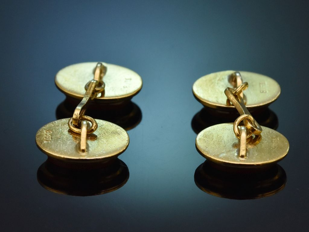 Die eleganten Manschettenknöpfe entstanden um 1955 und sind ein stilvolles und klassisches Accessoire für den Herren, das sowohl ungraviert, als auch mit Initialen oder Wappen graviert getragen werden kann. Auf Wunsch lassen wir einen solchen Auftrag gerne zum Selbstkostenpreis für Sie durchführen. Sprechen Sie uns diesbezüglich einfach an!