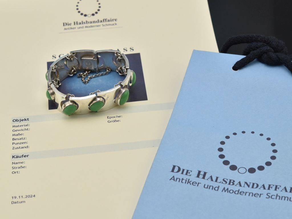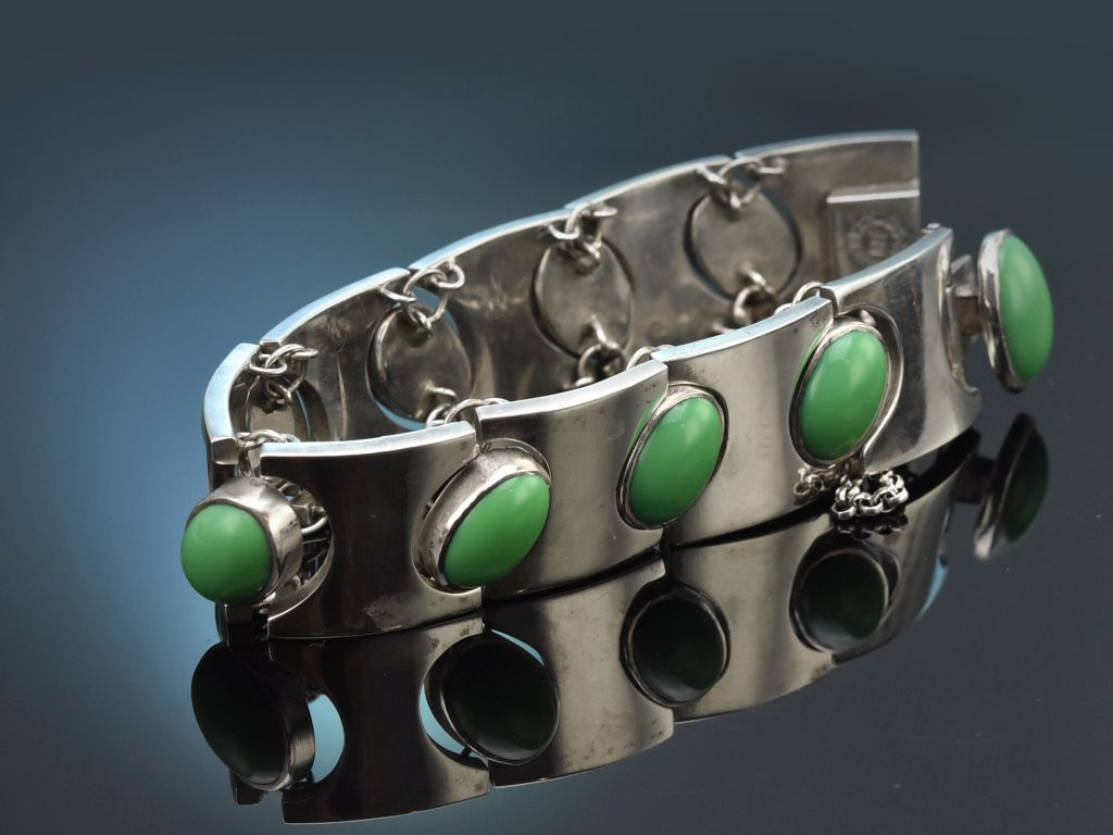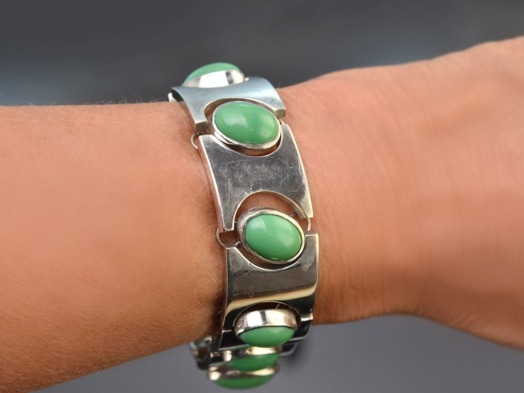 Das schöne Silberarmband besteht aus neun Gliedern, in deren konkaven Aussparungen ovale, hellgrüne Achat-Cabochons eingearbeitet sind. Alle Elemente sind beweglich miteinander verbunden. Somit schmiegt sich das Armband schön um das Handgelenk. Das glänzende Silber und die intensive Grünfärbung der Achat-Cabochons bilden einen interessanten Kontrast und ergeben ein klares, geometrisches Muster, das typisch für die Entstehungszeit um 1960 ist.