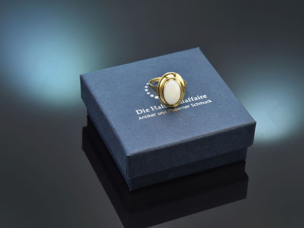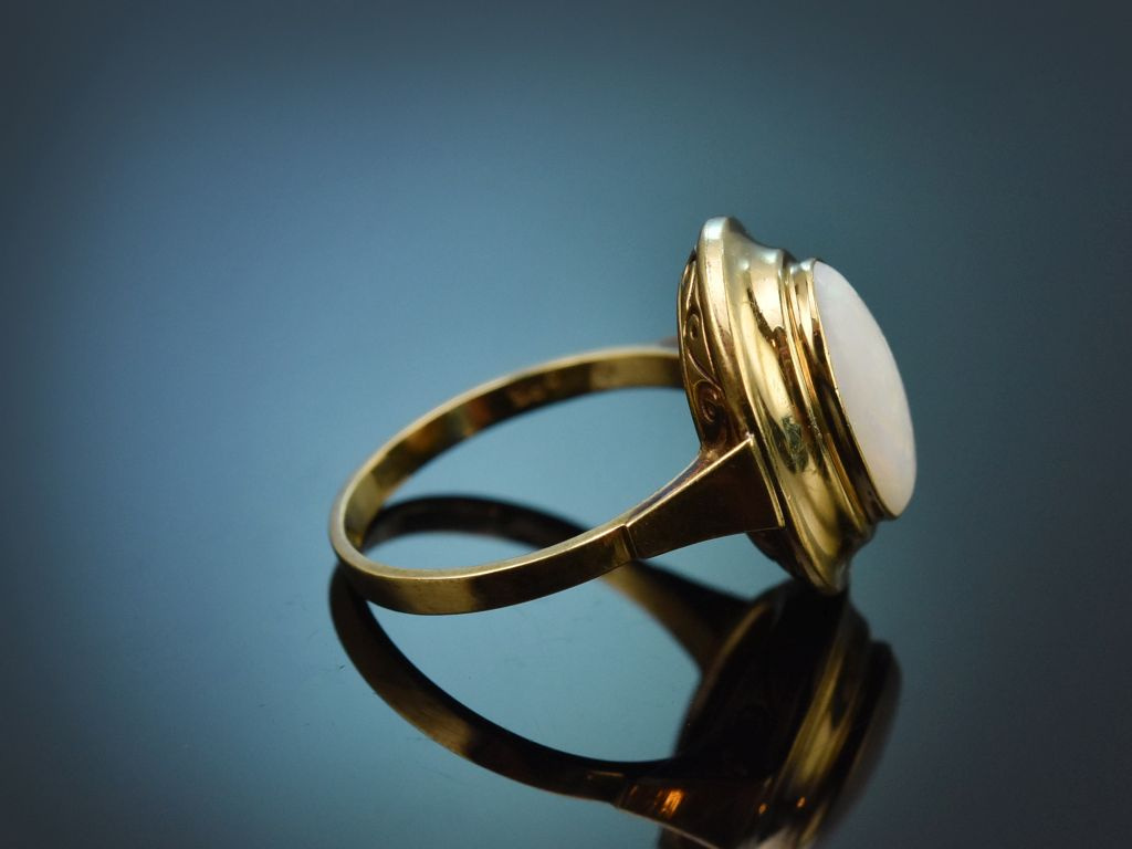 Der ovale Ringkopf präsentiert einen australischen Opal in Cabochonschliff von ca. 1,5 Carat mit wunderschön lebhaftem Opalisieren. Die getreppte Zargenfassung aus Gelbgold harmonisiert sehr schön mit dem hellen, schimmernden Edelstein und ist an der Unterseite hübsch mit einem filigranen Volutenmuster verziert. Eine schlichte, stabile Ringschiene rundet den schönen Entwurf passend ab.