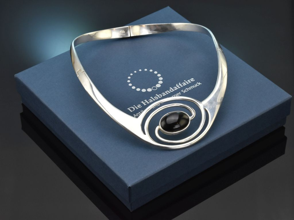 Das coole Statement Schmuckstück ist wie ein Halsreif zu tragen, verfügt jedoch über zwei Scharniere, wodurch es weit geöffnet und einfach angelegt werden kann. Mittig prägt ein großes durchbrochenes Spiralmotiv den Entwurf, der von einem tiefschwarzen Onyx in Cabochonschliff und Zargenfassung abgerundet wird.