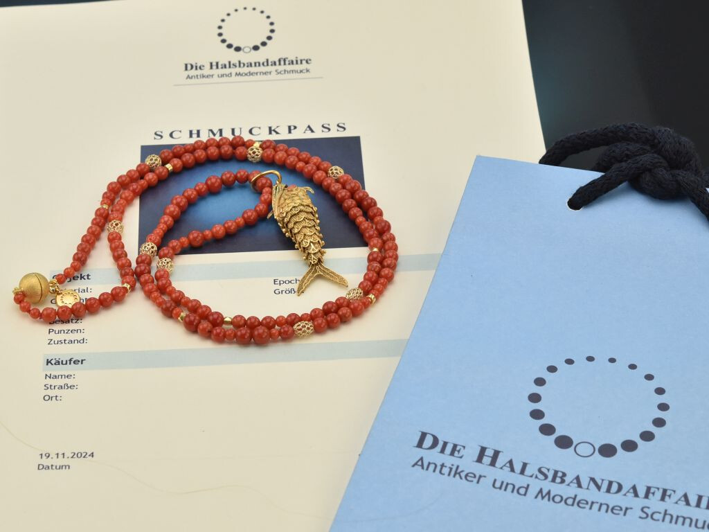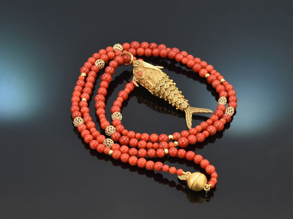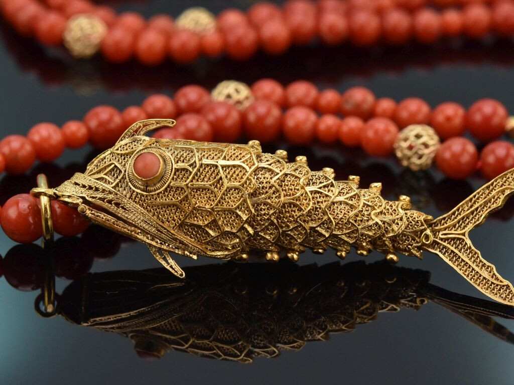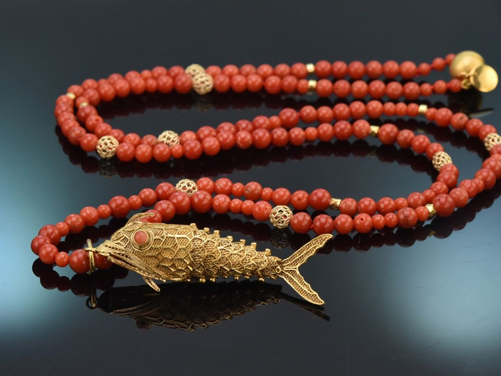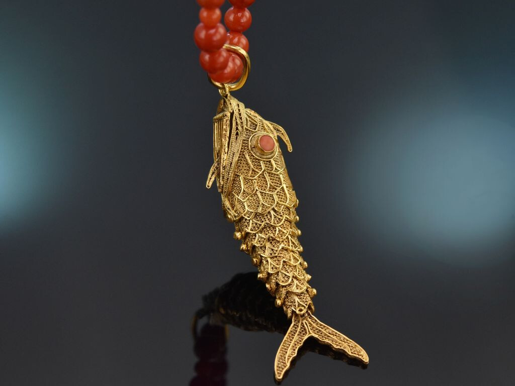 Schicker filigraner Vintage Fisch-Anhänger mit langer Korallen Kette, gearbeitet aus vergoldetem Silber (gestempelt und garantiert)