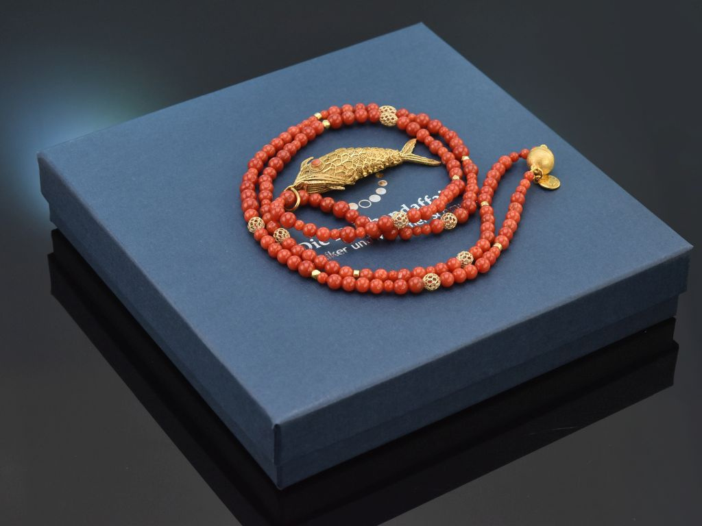 Der detailliert gearbeitete Anhänger in Form eines Fisches besteht aus einzeln montierten Filigrangliedern und ist dadurch wunderbar beweglich. Seine Augen werden von zwei echten Lachskorallen in Cabochonschliff akzentuiert. Der Fischmund lässt sich über einen kleinen Hebel öffnen und birgt ein Geheimfach, in dem kleine Andenken verwahrt werden können.