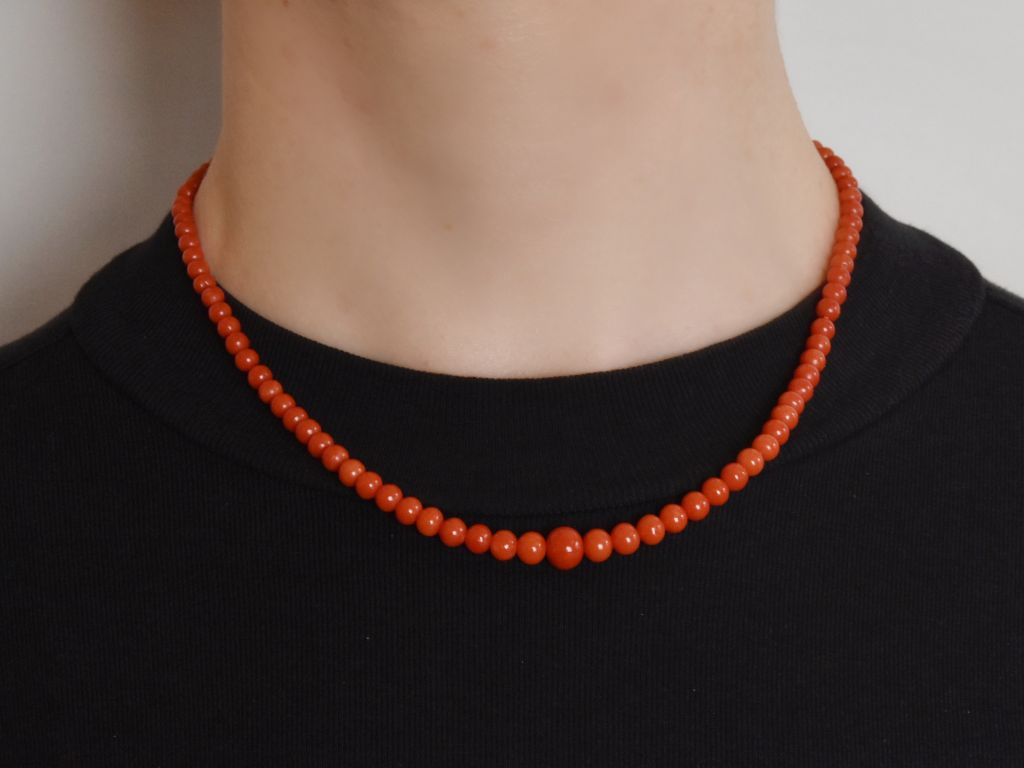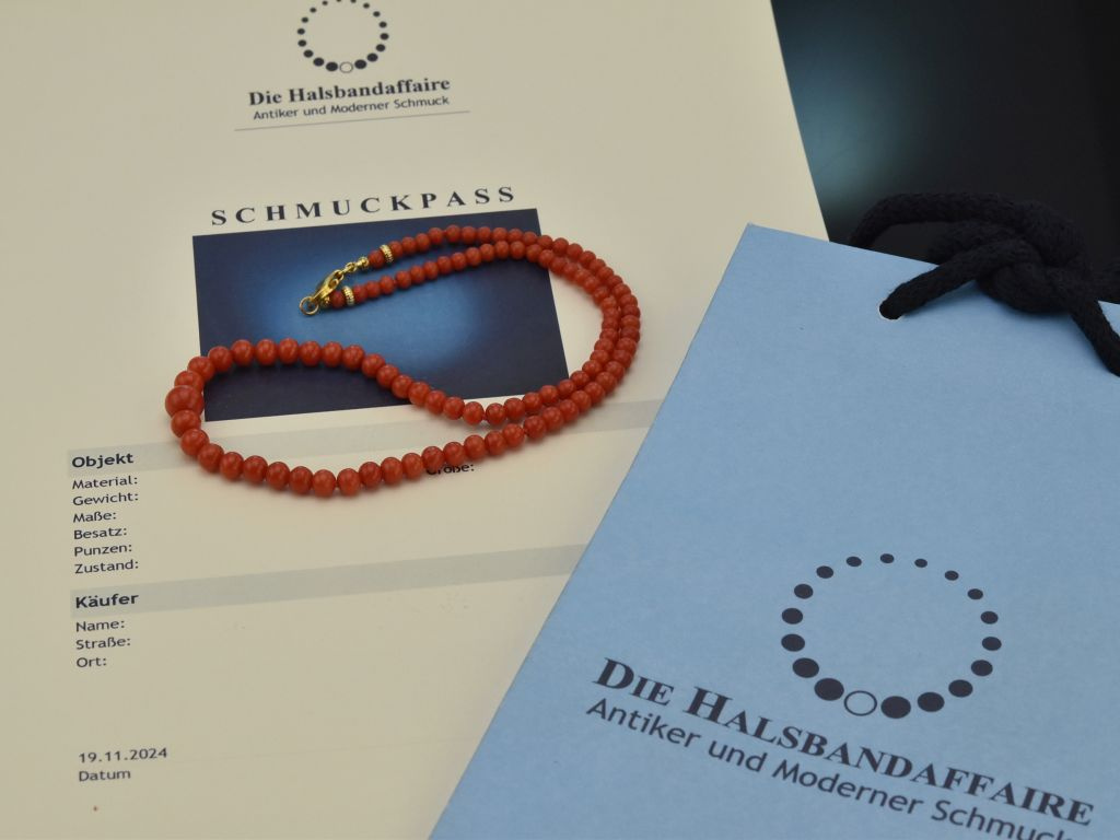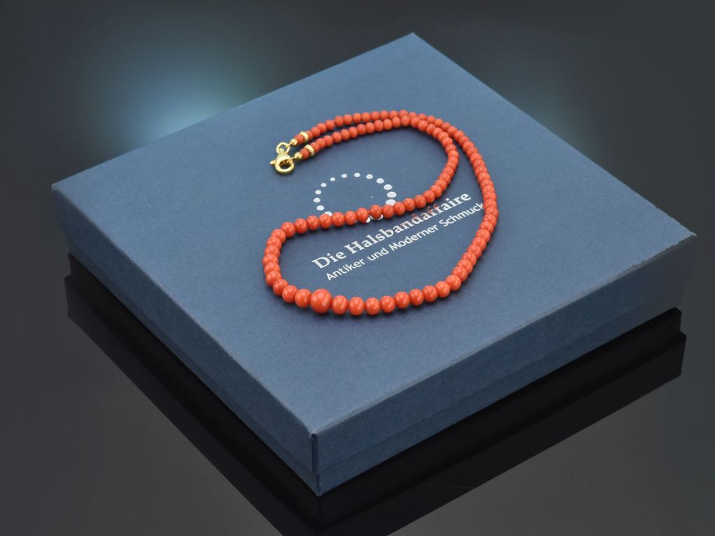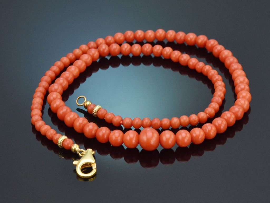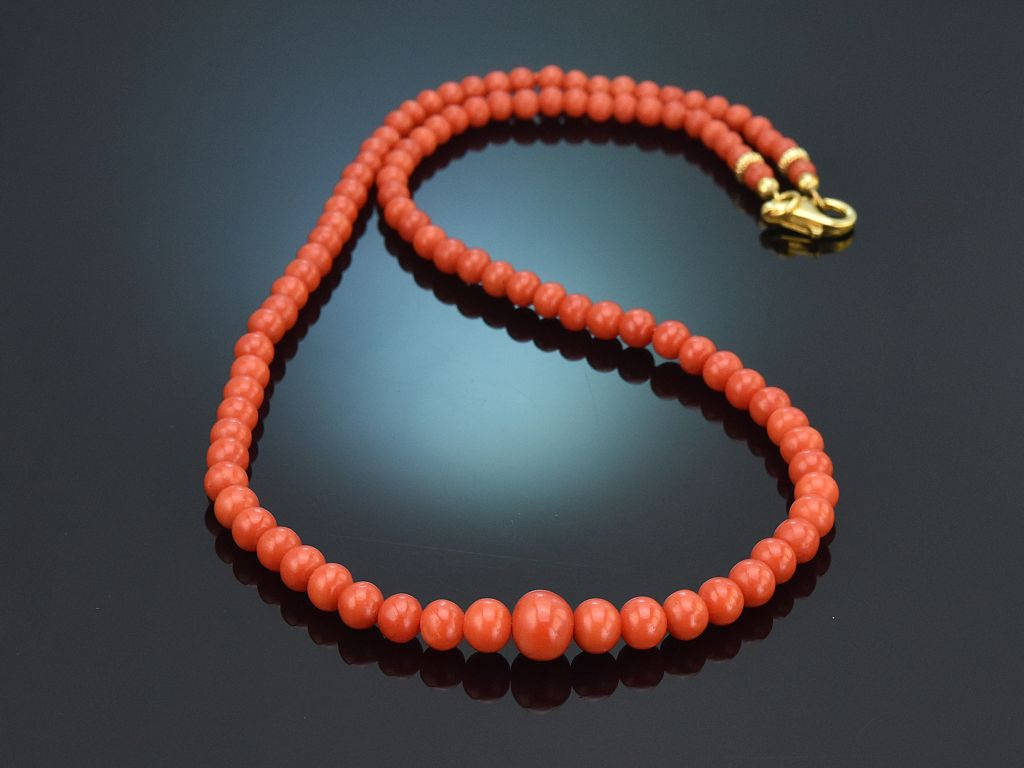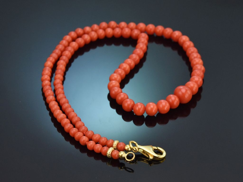 Die klassische Korallenkette besteht aus einem Strang unbehandelter italienischer Mittelmeerkorallen in einem wunderbaren seltenen und intensiven Rotton. Die einzelnen Korallenkugeln sind im Größenverlauf aufgezogen und münden in einem neu ergänzten Karabinerverschluss aus vergoldetem Silber 925. Zwei kleine Zierkügelchen neben dem Verschluss setzten einen hübschen Akzent.