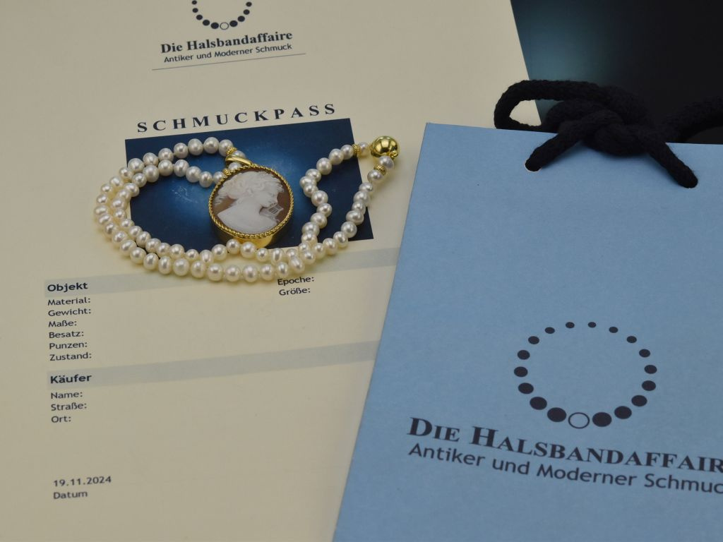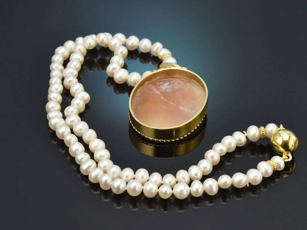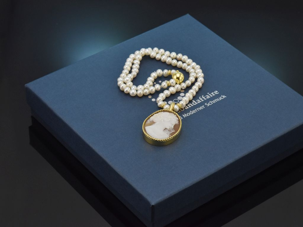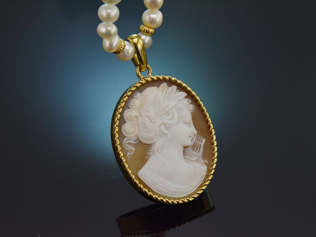 An einer feinen Kette aus Süßwasser Zuchtperlen mit schimmerndem weißen Lüster sitzt eine fein geschnittene Muschelkamee mit der antikisierenden Darstellung eines Frauenprofils nach rechts. Durch das seitliche Attribut, eine Lyra, kann es sich hier um Euterpe, die Muse der Musik handeln, die in der griechischen Mythologie gerne mit dem sogenannten Aulos (der Doppelflöte), oder der Lyra dargestellt wird. Gerahmt wird die schöne Gemme mit einem schmalen und passenden Kordelrand.