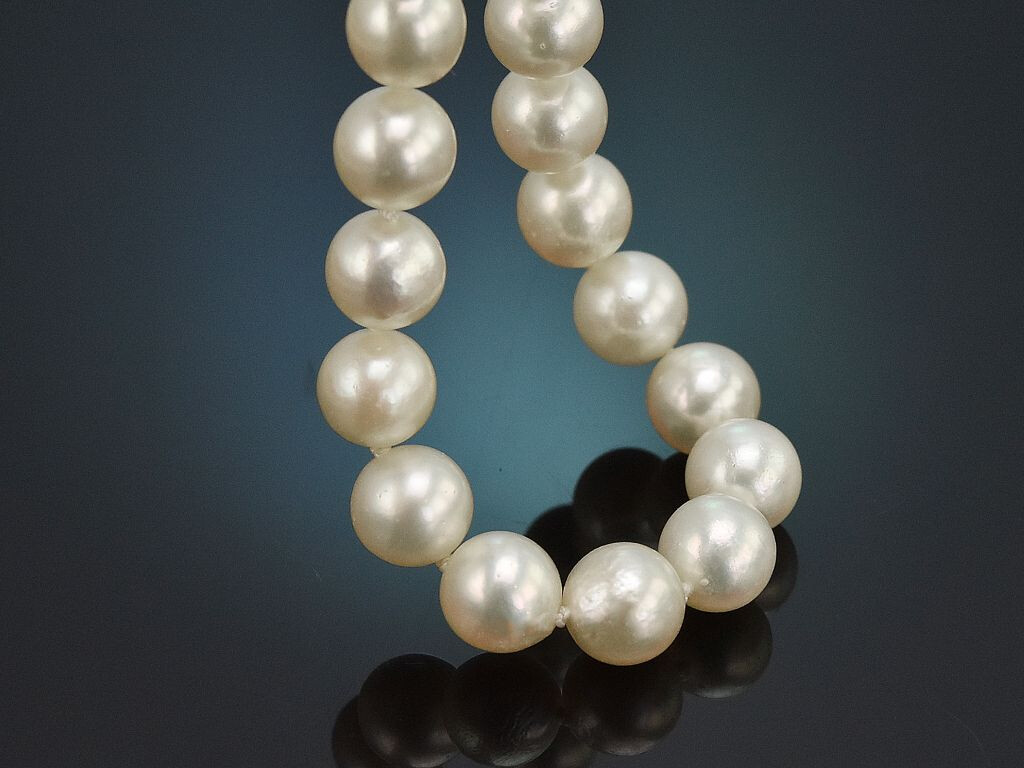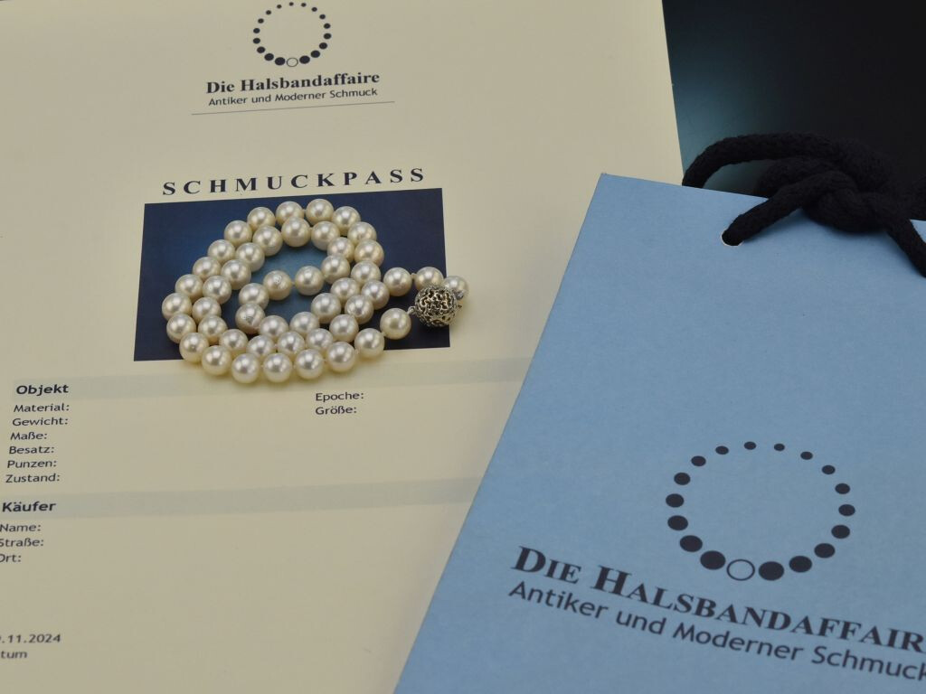 Die Perlenkette entstand um 1985 und wurde in unserer Werkstatt gereinigt und mit Perlseide geknüpft. Mit ihren elegant schimmernden Akoya-Perlen ist sie ein zeitloses Schmuckstück, das zu vielen Anlässen getragen werden kann.