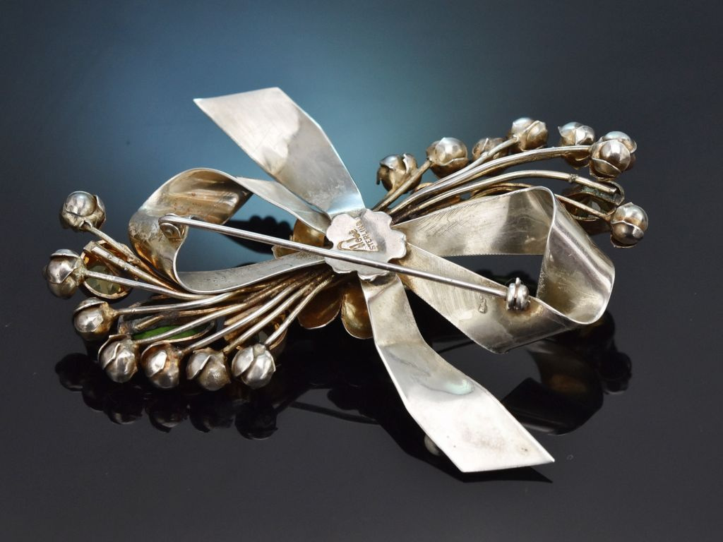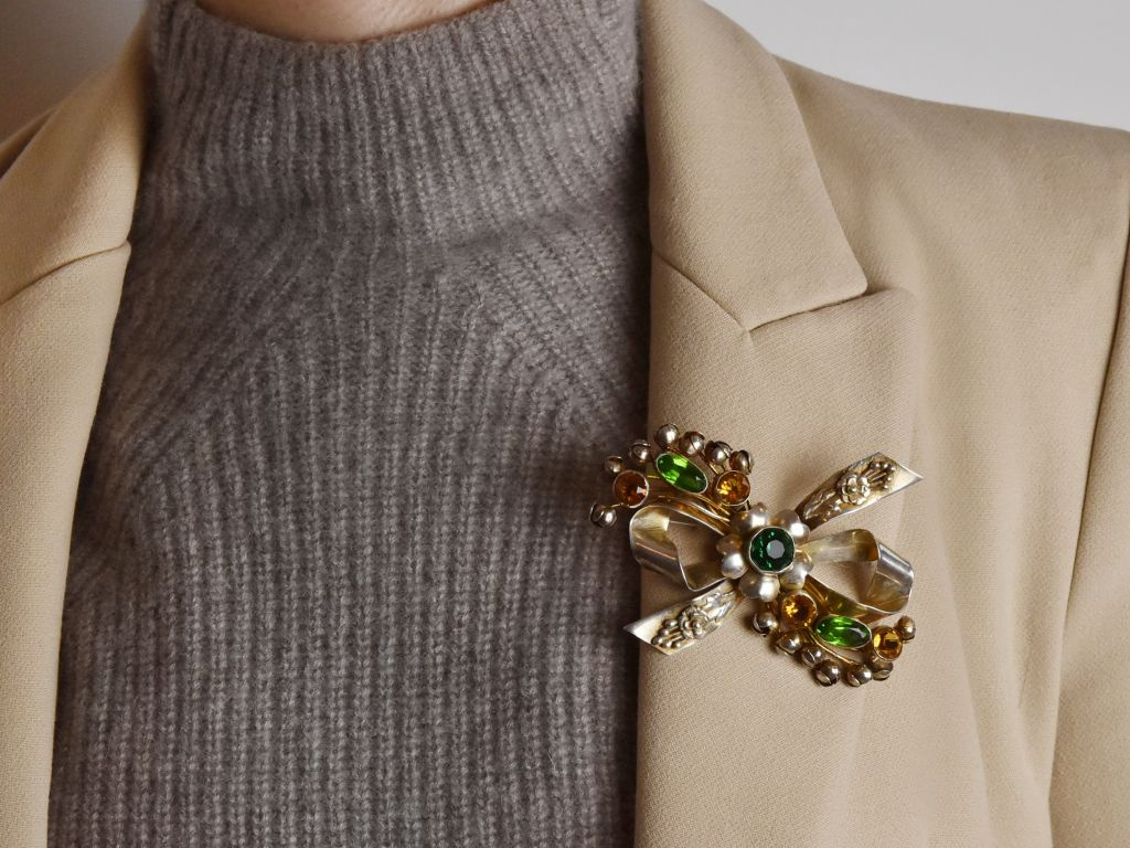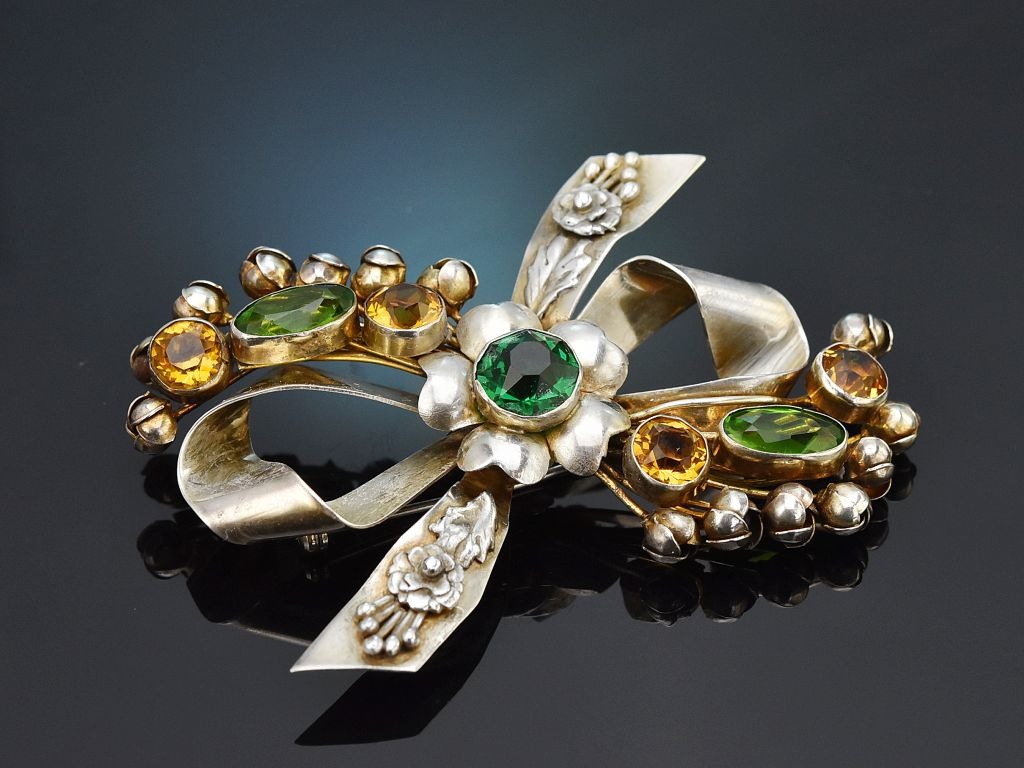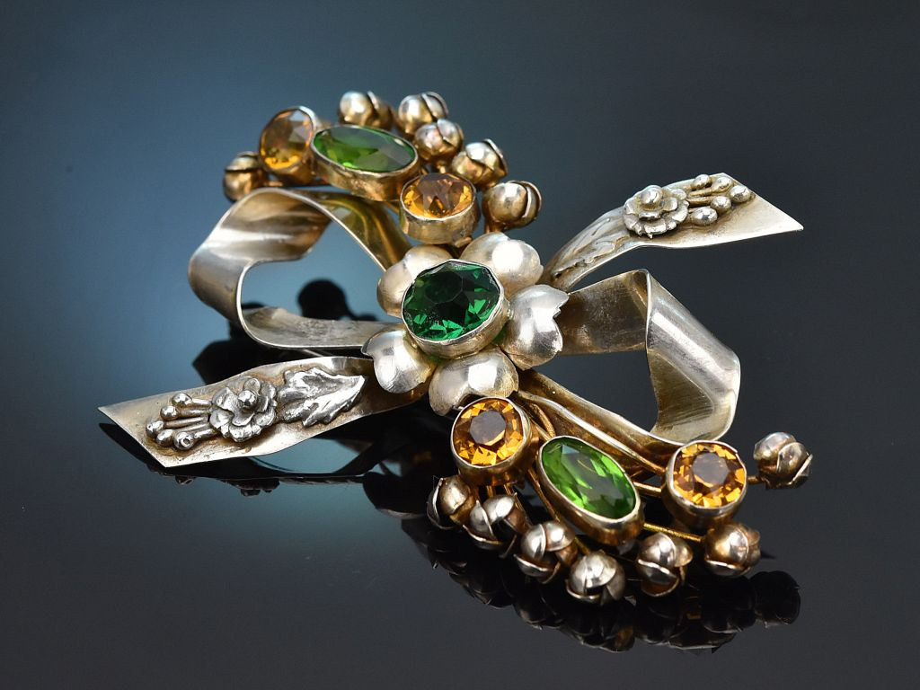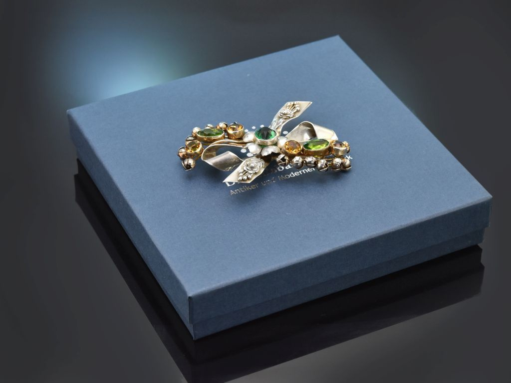 Die imposante, große schleifenförmige Brosche ziert mittig eine Blume mit grünem Glasstein. Oberhalb und unterhalb der Blume wird das Schleifendesign mit einem Schweif aus Knospen und weiteren grünen und gelben Glassteinen ergänzt. Zusätzliche florale Elemente auf den Bändern schaffen eine wunderbare Verbindung zwischen Schleife und Blumenarrangement.