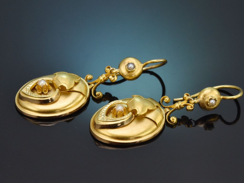 Ovale Hängeelemente mit gewölbter Mitte sind mit bandartig gelegten Zierelementen und je einer floral gefassten Saatperle dekoriert. Zwei bewegliche und filigran ausgeführte Volutenelemente verbinden die Plaketten mit den runden, perlenbesetzten Brisuren, die von weich geschwungene Ohrhaken ergänzt werden.