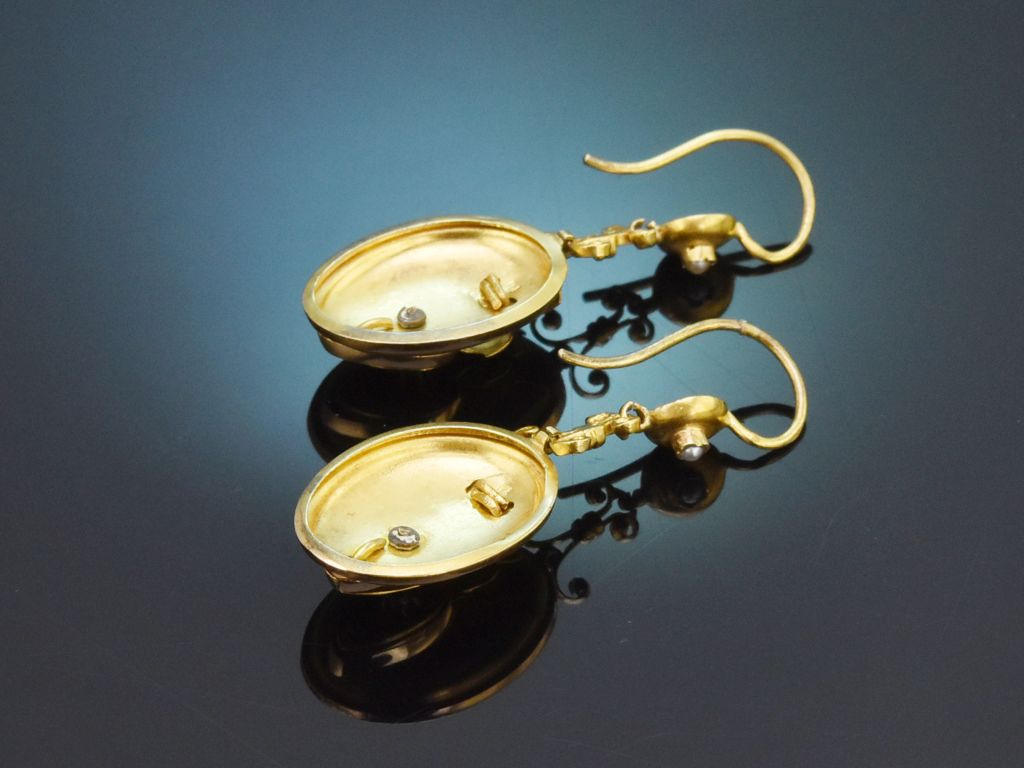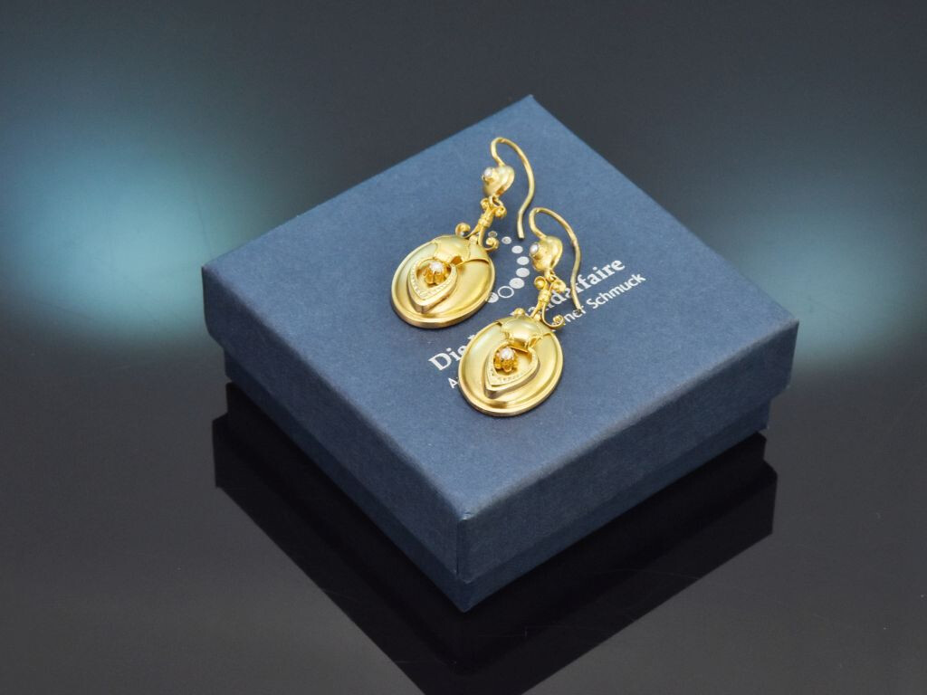 Die hübschen Ohrhänger sind zeittypisch aus gedrücktem, zart satiniertem Gold gearbeitet und angenehm und leicht zu tragen. Sie entstanden um 1880, also gegen Ende der Biedermeierzeit, in Wien und können heute als authentische Zeitzeugen des 19. Jahrhunderts getragen werden. Durch ihren historischen Charme passen sie zu allen klassisch eleganten Stilen oder auch zum feinen Dirndl.