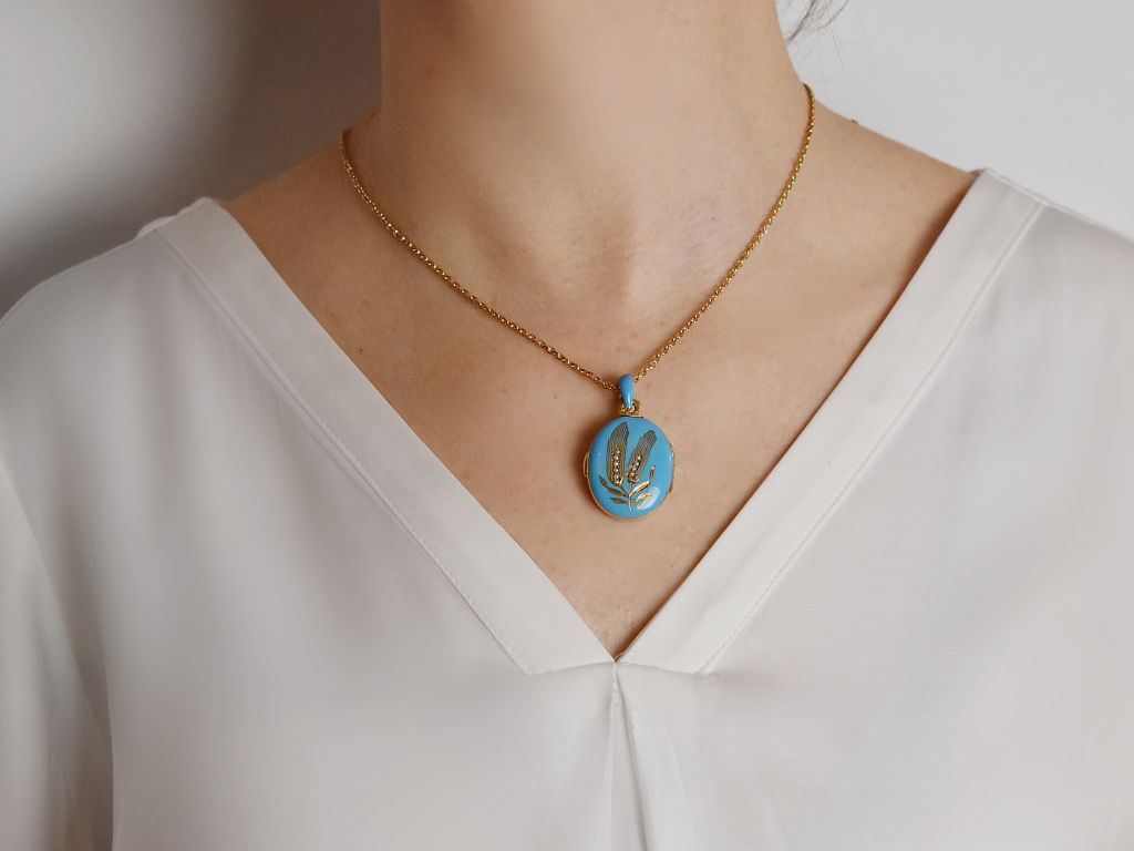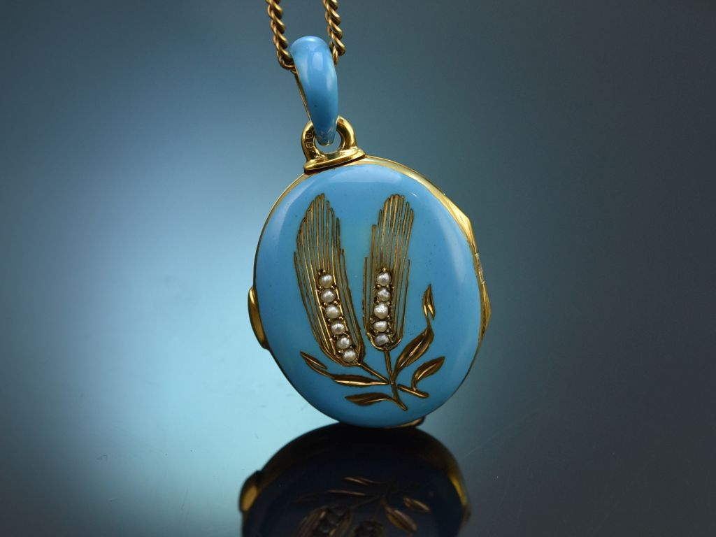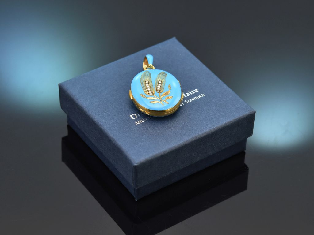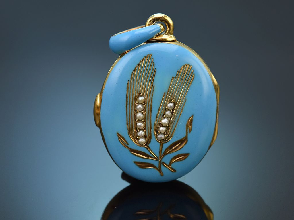 Das ovale Medaillon ist vorderseitig mit einer vergoldeten Gerstenähre verziert, die mit elf kleinen, weiß schimmernden Saatperlen besetzt ist. Das Gerstenmotiv ist eingebettet in eine perfekt erhaltene Emaillierung in kräftigem Türkisblau. Auch die großzügige Öse und die Rückseite des Medaillons sind mit Emaille dekoriert.