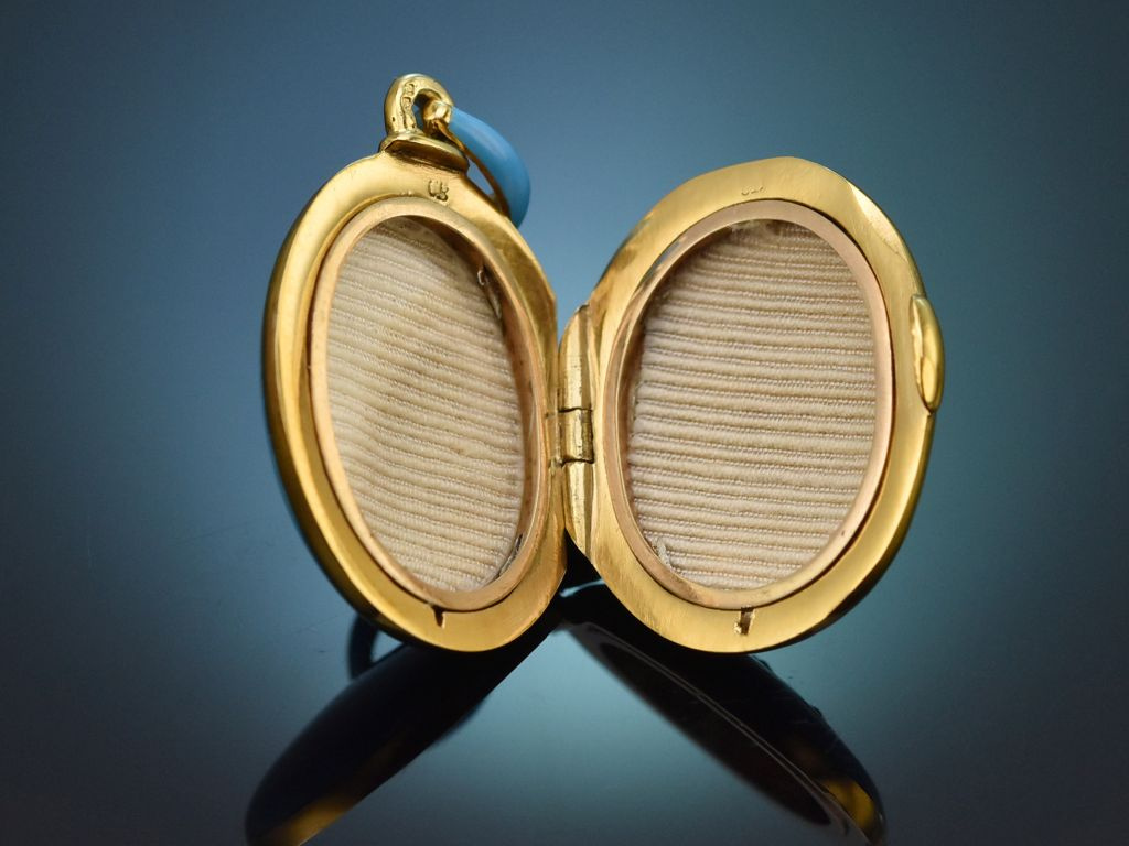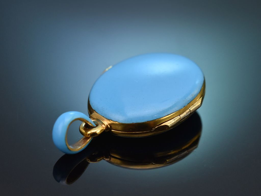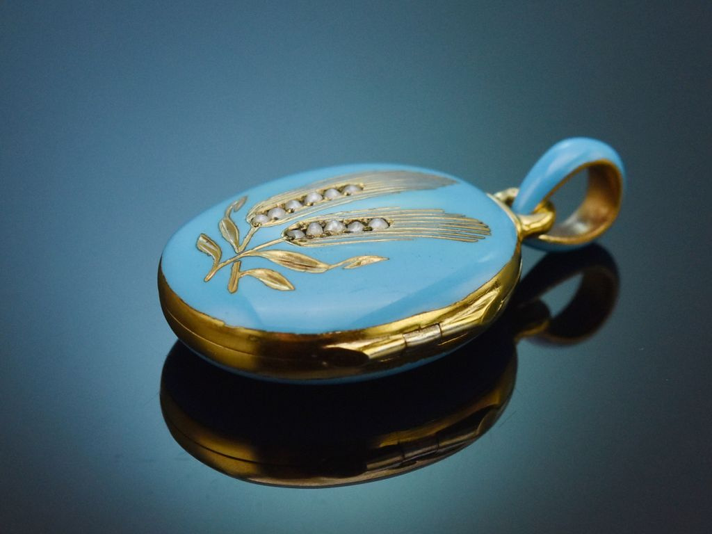 Besonders schöner bistorischer Medaillon-Anhänger mit türkisblauer Emaillierung und Saatperlen, gearbeitet aus vergoldetem Silber (gestempelt, geprüft und garantiert).