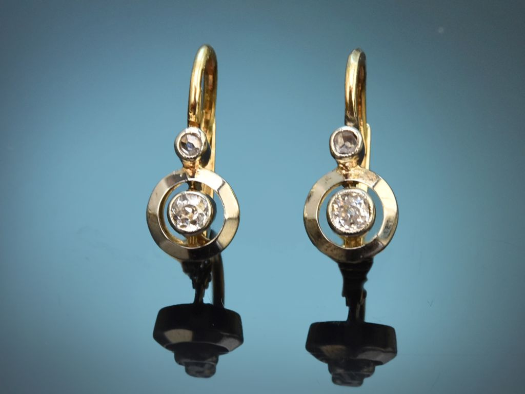 Wie zur damaligen Zeit üblich, sind die Ohrringe aus Gelbgold gearbeitet und mit einer Auflage aus Platin versehen, sodass die Diamanten besonders schön zur Geltung kommen.