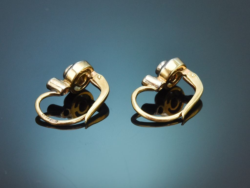 An praktischen Klappbügelbrisuren sitzt jeweils ein funkelnder runder Altschliffdiamant, der von einem Ring aus Gold und Platin umgeben ist. Eine kleine Diamantrose am oberen Ende vervollständigt den schlichten und wirkungsvollen Entwurf. Die Diamanten haben zusammen ein Steingewicht von ca. 0,18 Carat und liegen im schönen Qualitätsbereich (J-K, SI1-SI2).