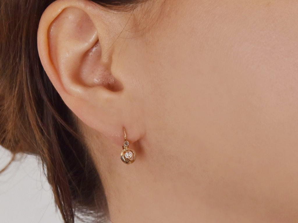Schlichte historische Diamant Dormeuse Ohrringe, gearbeitet aus Gelbgold 585 / 14 Kt und Platin (geprüft und garantiert).