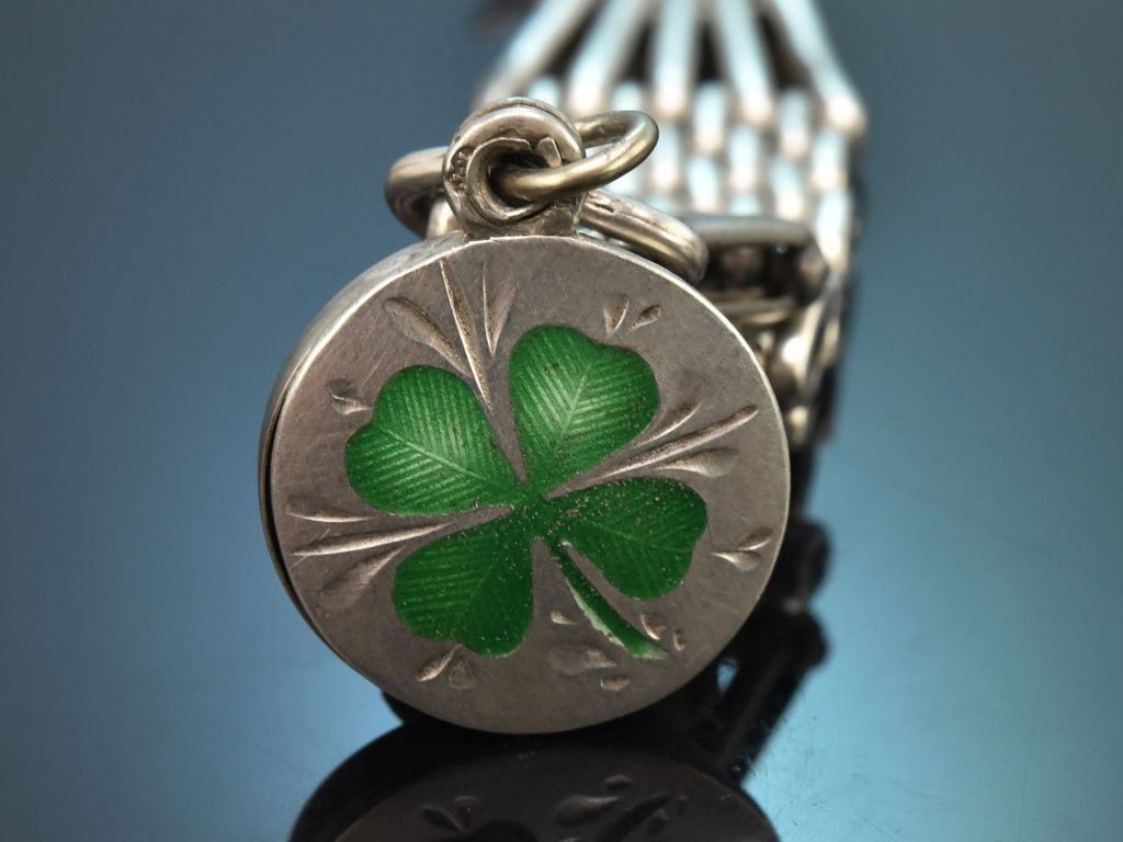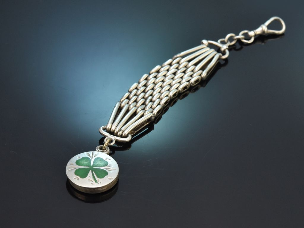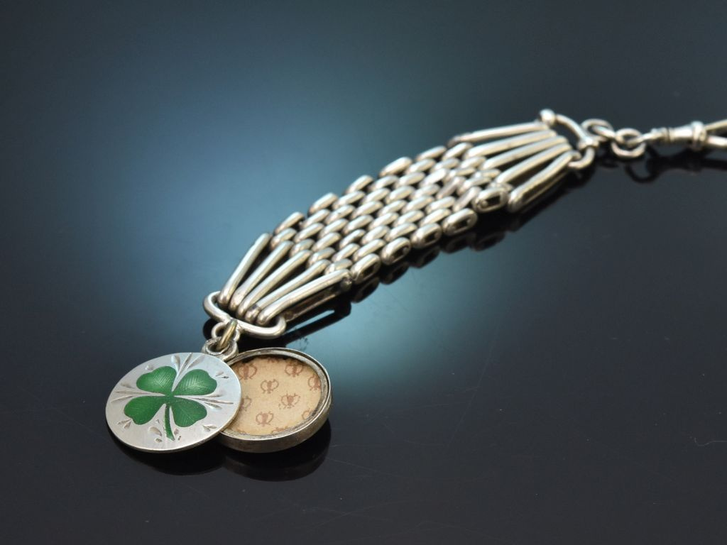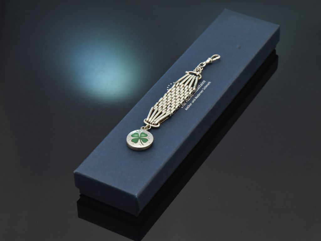 Der vorliegende Uhrenzipfel besteht aus einem soliden Karabinerhaken, von dem ein apart gearbeitetes Mittelteil in Reiskornmuster (grain de riz) ausgeht. Das Ende des Schmuckstückes ziert ein bezaubernder Anhänger mit grün emailliertem Kleeblatt. Hinter dem Glücksklee verbirgt sich ein kleines Fach, in dem individuelle Souvenirs oder Fotos aufbewahrt werden können.