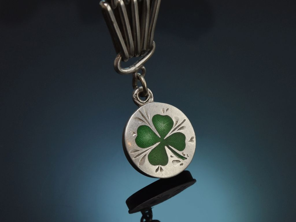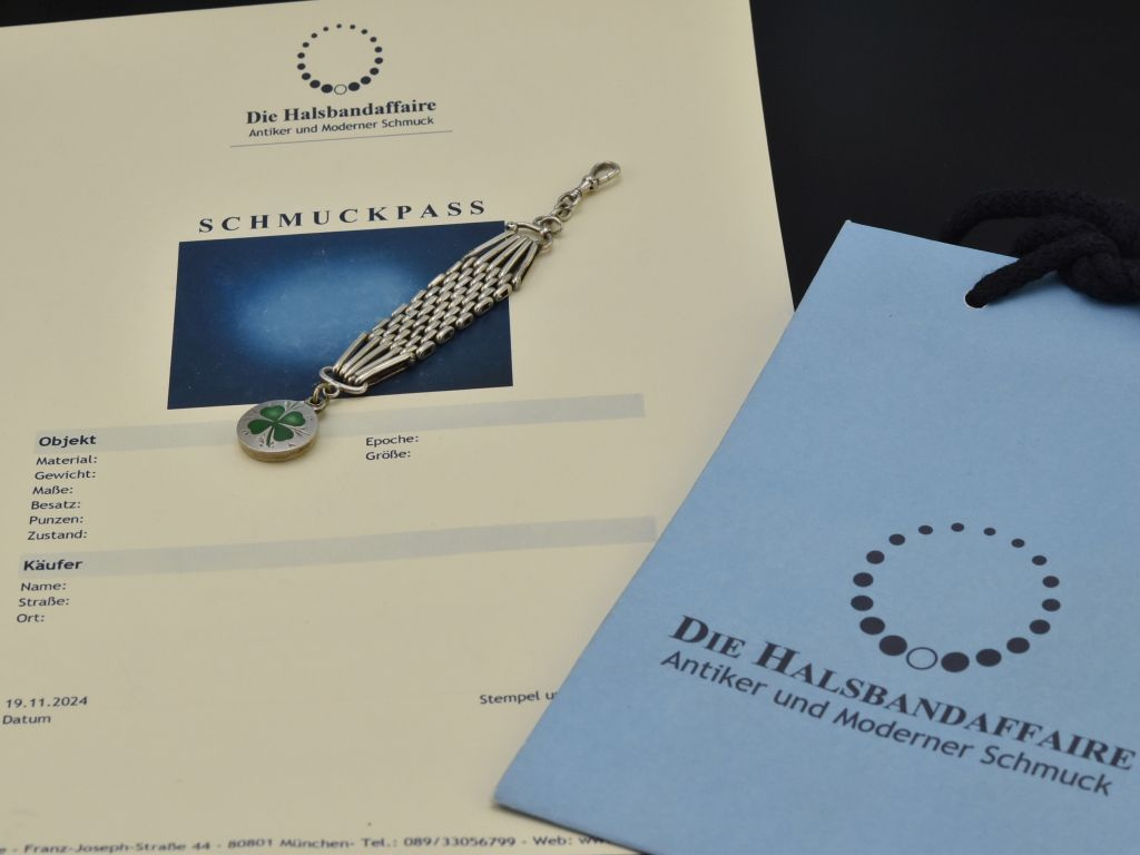 Der charmante Uhrenzipfel entstand um 1910 in Wien. Er ist ein ausgesuchtes Liebhaberstück, das heute sowohl von Damen als auch von Herren getragen werden kann und seinen Platz nicht nur an der Chatelaine findet, sondern zum Beispiel auch an der Handtasche, am Hosen- oder Schlüsselbund. Durch das vierblättrige Kleeblatt macht sich das Schmuckstück auch wunderbar als Geschenk oder Glücksbringer und Talisman.