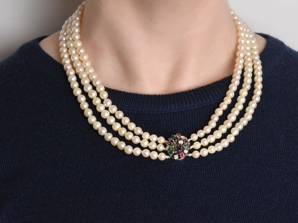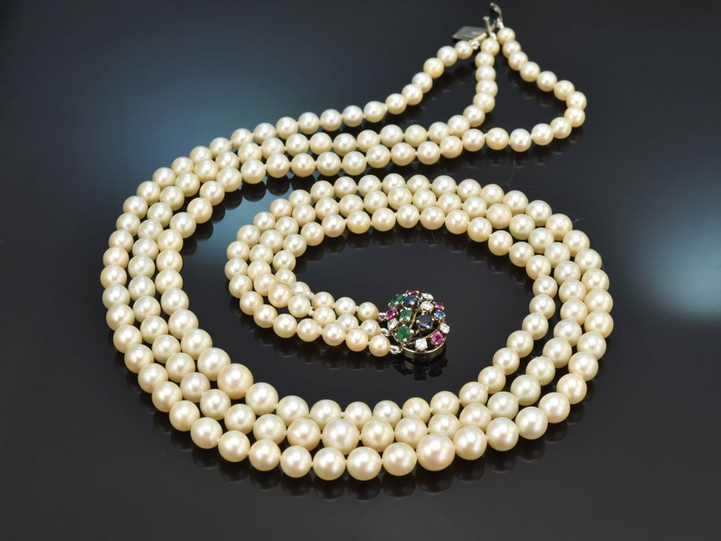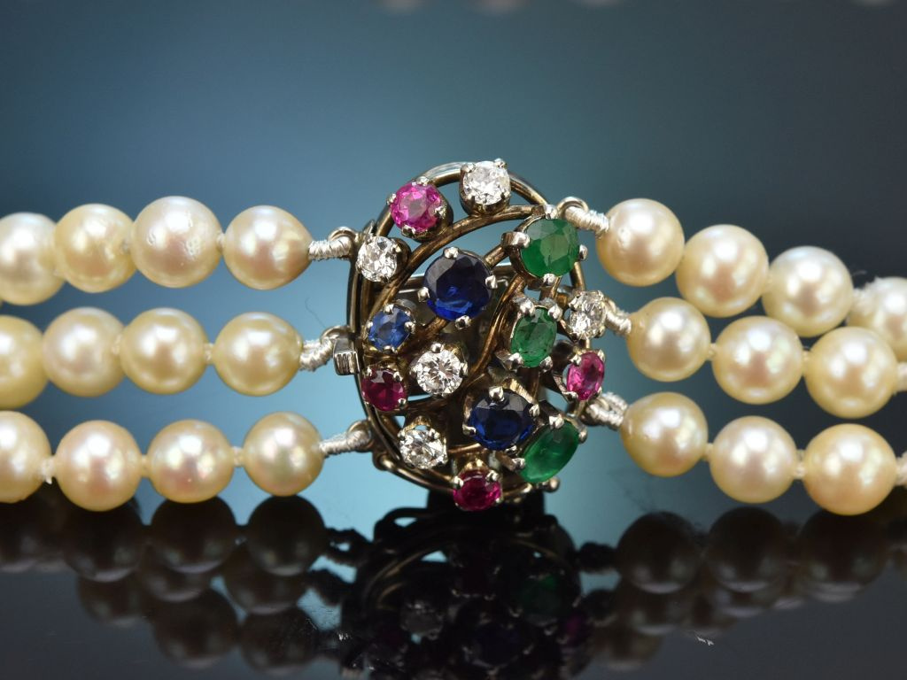 Elegante und feine dreireihige Perlenkette aus Akoya Zuchtperlen und einer Zierschließe mit Diamanten, Saphiren, Rubinen und Smaragden, gearbeitet aus Weißgold 585 / 14 Kt (gestempelt und garantiert).