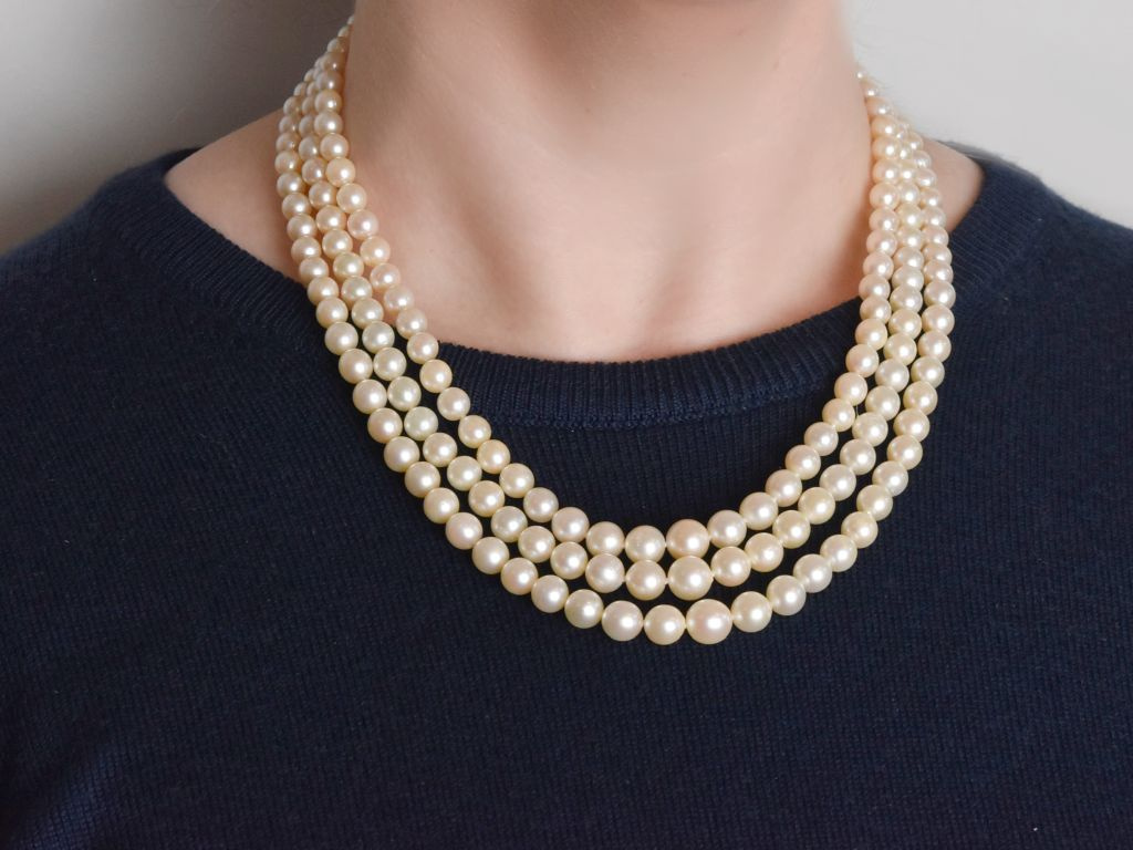 Das hochwertige Collier besteht aus drei Reihen runder, milchweißer Akoyazuchtperlen mit sehr schönem feinen, ebenmäßigen Lüster. Die Perlen sind im Größenverlauf angeordnet und legen sich wunderbar parallel um den Hals. Die edle ovale Zierschließe aus Weißgold ist mit den „Big Four“ der Edelsteine besetzt: drei leuchtend grüne Smaragde mit einem Gesamtgewicht von ca. 0,49 ct, drei royalblaue Saphire von insgesamt ca. 0,38 ct, vier pinkrote Rubine mit zus. ca. 0,30 ct sowie vier funkelnde Brillanten von insgesamt ca. 0,45 ct (G-H, VS2-SI1). Die Kette kann variabel, entweder mit der Zierschließe seitlich, vorne, oder hinten im Nacken getragen werden.