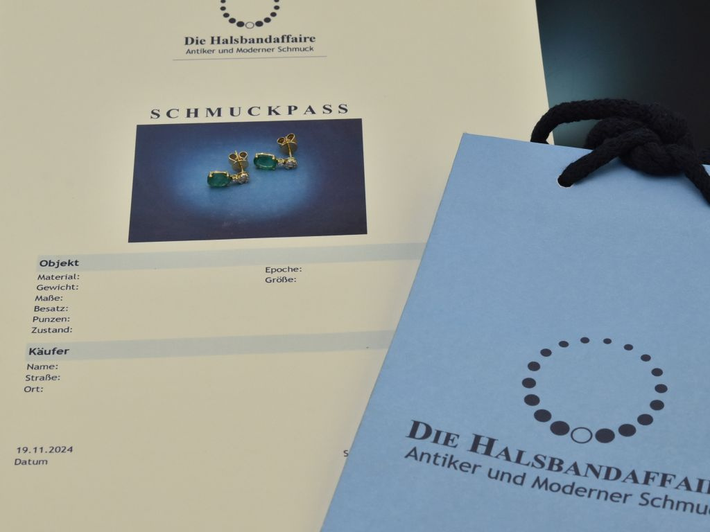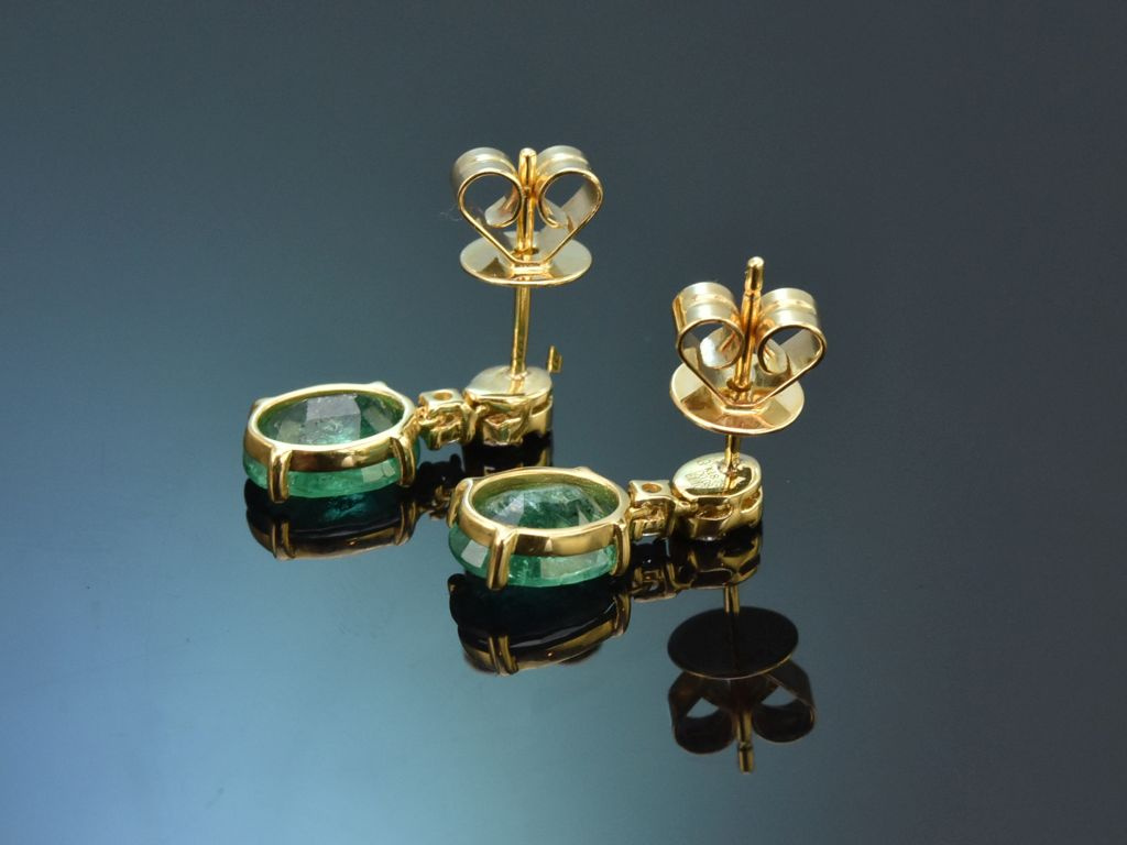 Je ein oval facettierter Smaragd von feiner Qualität und Farbe schwingt an beweglichen Brisuren, die mit je sieben Brillanten und drei Diamanten in Baguetteschliff besetzt sind. Die feinen Smaragde haben ein Gewicht von zus. 2,20 Carat, die Diamanten zus. 0,16 Carat und liegen im schönen Qualitätsbereich (G-H, SI1-SI2).