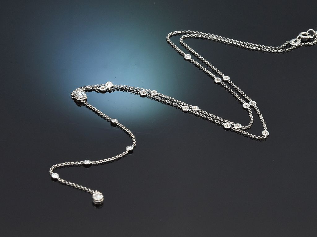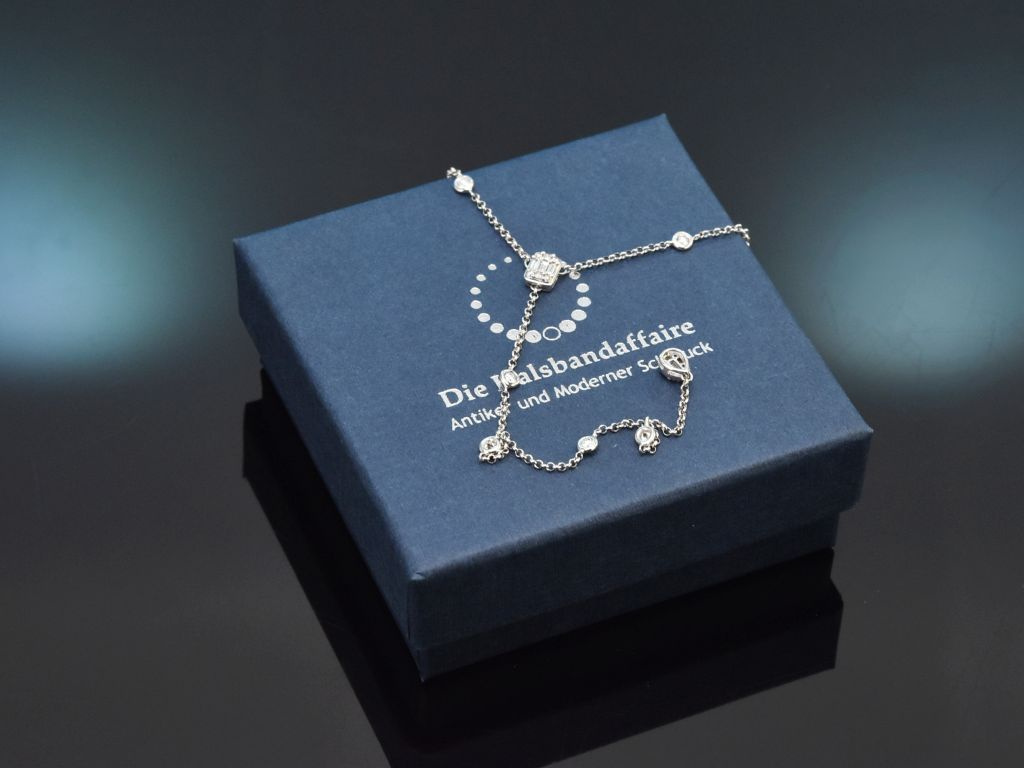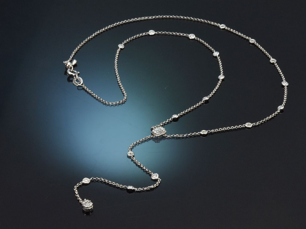 Das elegante Collier besteht aus einer feinen Ankerkette, die in regelmäßigen Abständen mit Diamanten in Brillantschliff besetzt ist und mittig in ein rechteckiges Element mündet, das mit Diamanten in Princess-, Baguett- und Brillantschliff besetzt ist. Einen raffinierten Abschluss bildet mittig eine lange Abhängung, die in einem diamantbesetzten Tropfenmotiv endet.
