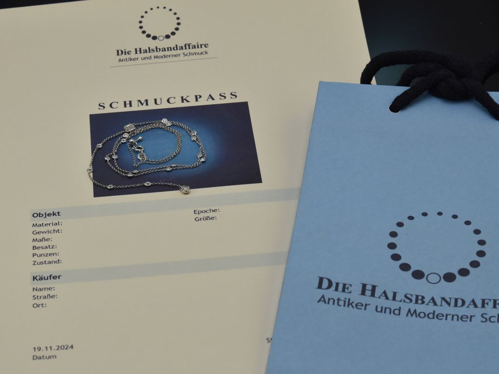 Sie erhalten das Collier liebevoll verpackt in einem unserer hübschen Etuis und mit Echtheitsgarantiezertifikat.
