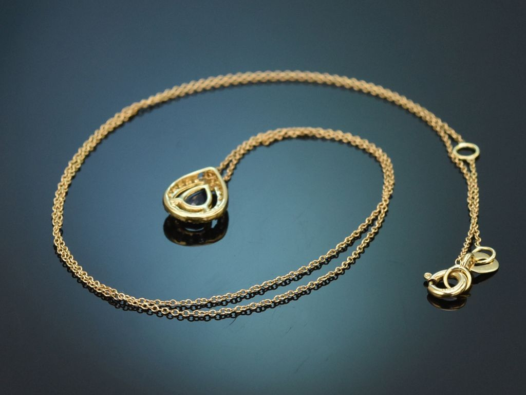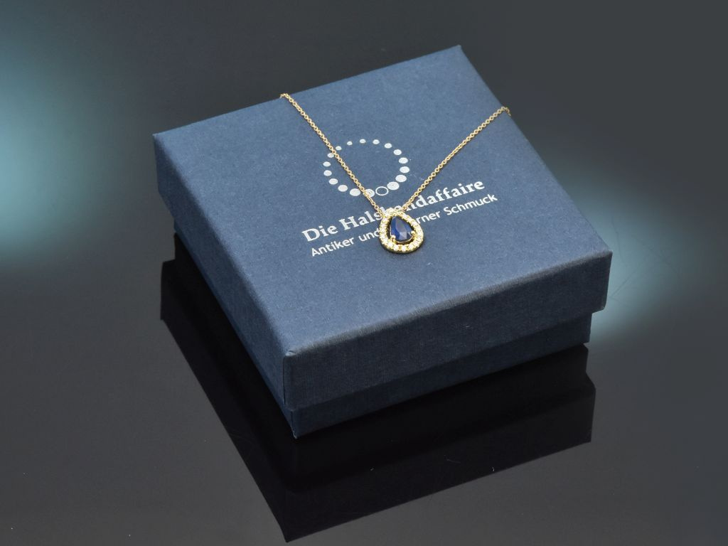 An einer feinen Kette in Ankermuster häng ein tropfenförmiger Anhänger der mittig von einem intensiv blauen Saphir von 0,35 Carat besetzt ist. Er wird von einem funkelnder Kranz aus Diamanten in Brillantschliff umrahmt, die zusammen ein Steingewicht von 0,10 Carat haben und im schönen Qualitätsbereich liegen. (G-H, VS2-SI1).