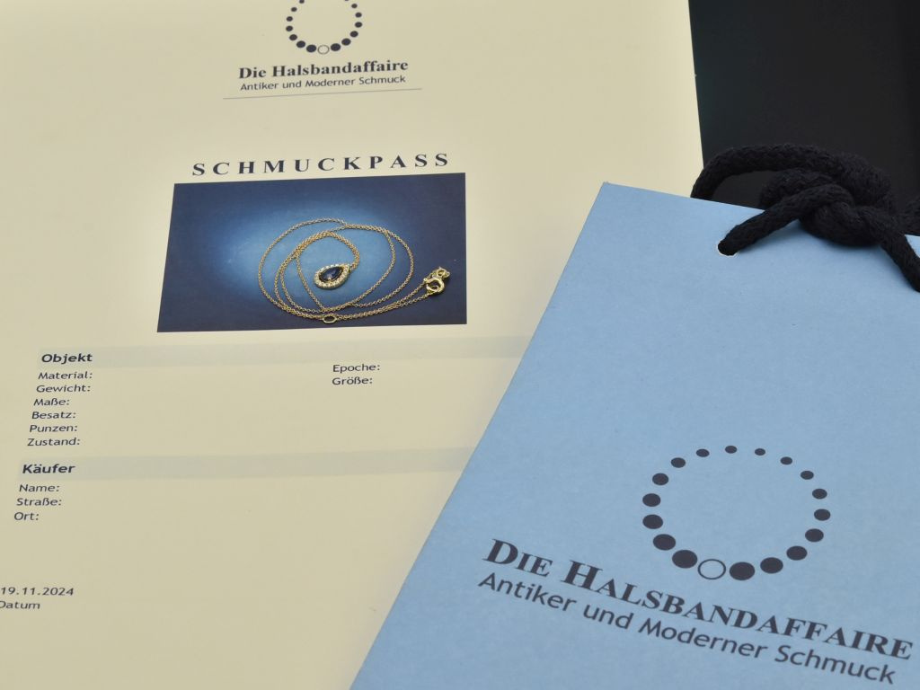 Sie erhalten das Collier liebevoll verpackt in einem unserer hübschen Etuis und mit Echtheitsgarantiezertifikat.