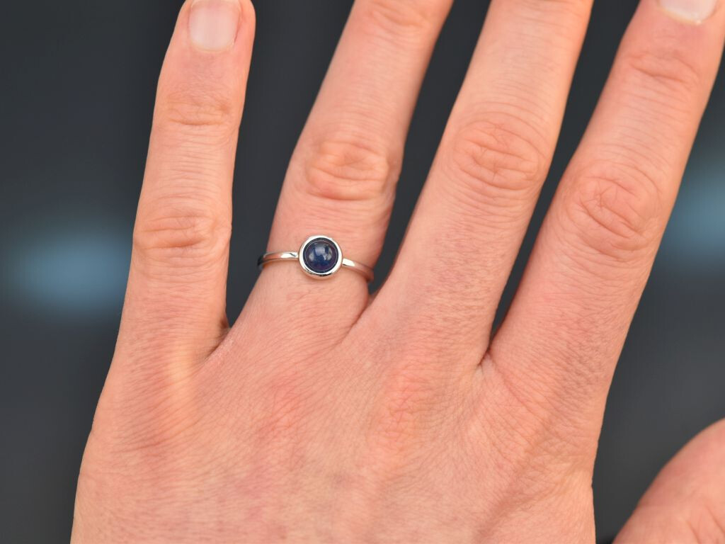 Der Ringkopf ist mit einem schönen blauen Saphir in Cabochonschliff besetzt. Der feine Edelstein sitzt in einer Zargenfassung und hat ein Gewicht von 1,3 Carat.